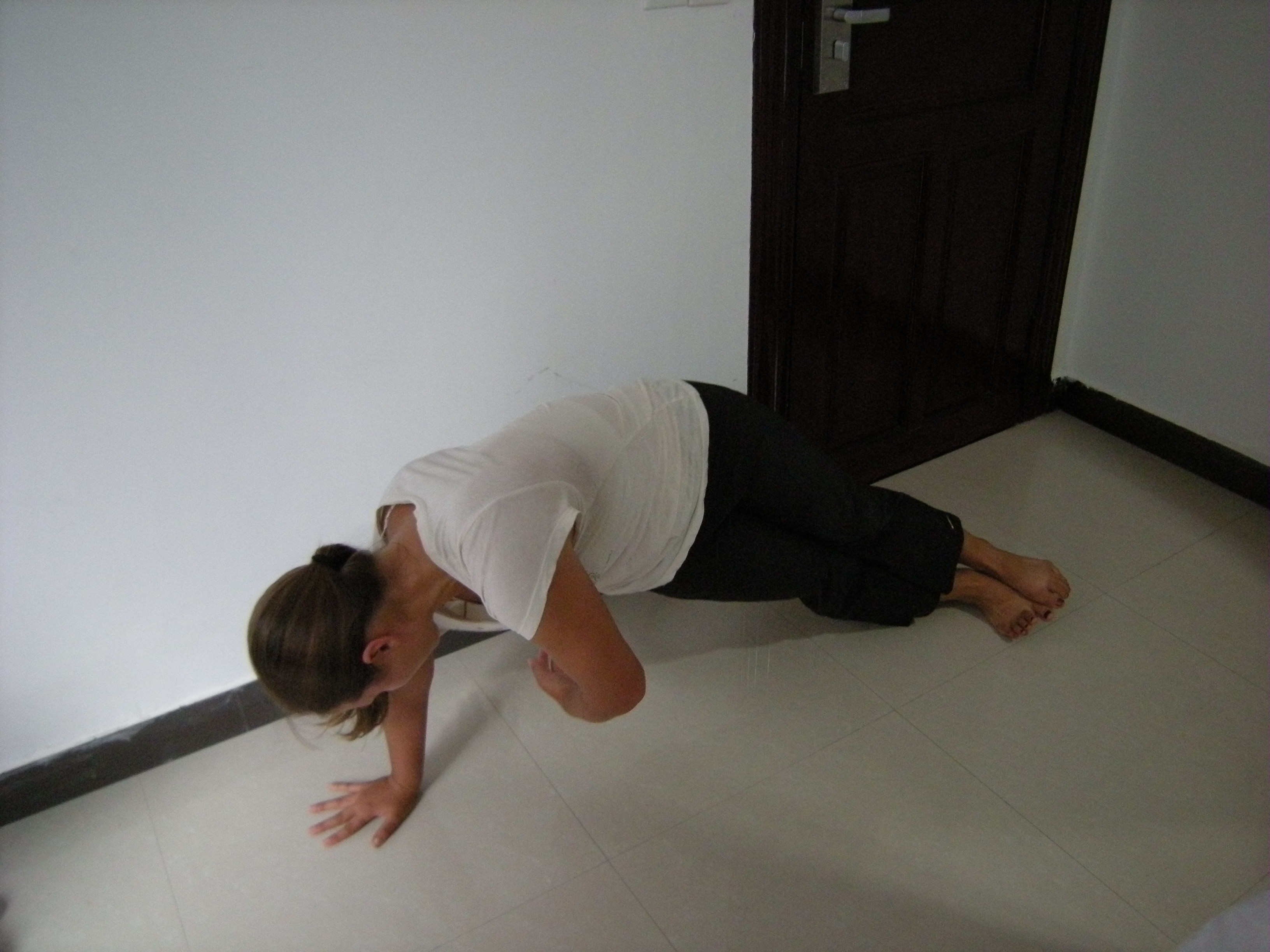 I did 5 sets of 10 repetitions (each push up counting as a rep) and this variation is a workout in itself! Try it! To make it easier you can always come to you knees for the push up.