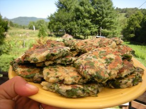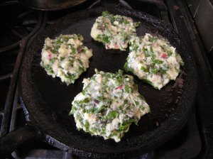 I added chopped raw chard, salt, pepper, dill, and eggs to make these patties. Honestly, they were a little blah. I would try them again but add much more fresh garlic and some chopped onions.