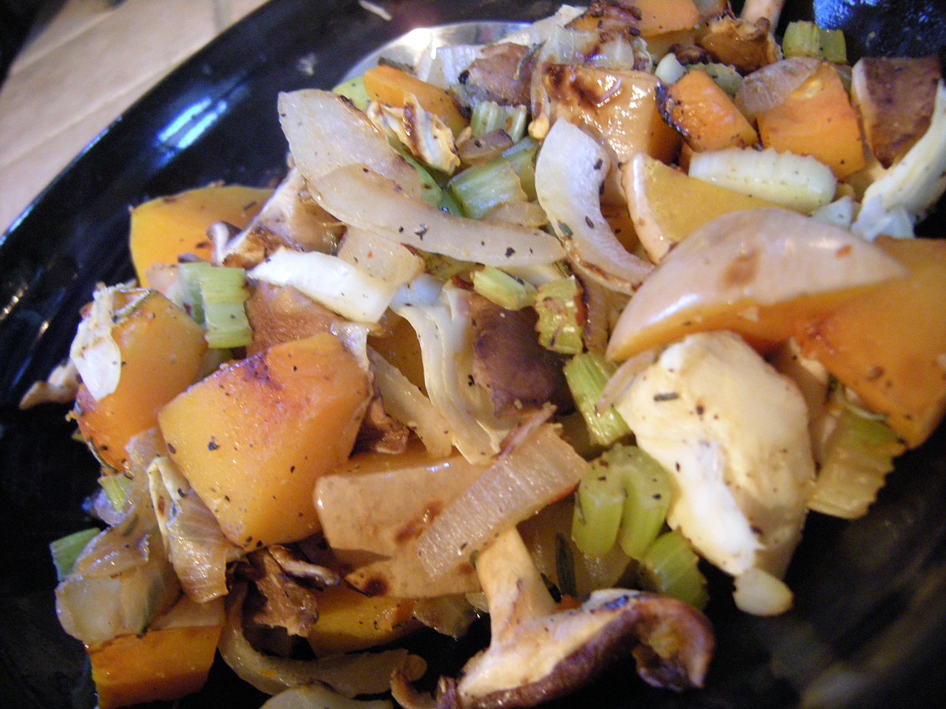 Sauteed onions, shitake mushrooms, butternut squash, celery, and artichoke hearts with a bit of olive oil, black pepper, rosemary (from the neighbors garden), red pepper flakes, and “rosemary sea salt flakes”.