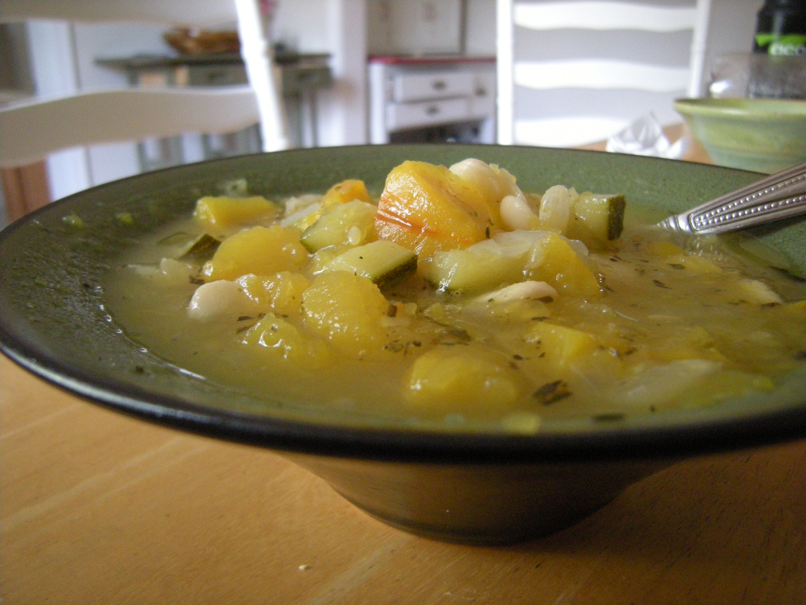 Toss first 5 ingredients into a stockpot and allow to sauté, stirring occasionally. When the onions are soft add the beans and a few cups of water. The amount of water you add depends on whether you want your soup more brothy or more hearty. Bring to simmer. Add pumpkin, zucchini, and hot pepper. When the lima beans are nearly cooked begin adding salt and pepper to taste. The beans and veggies will soak up the salt so you may wish to add salt and fresh ground pepper at the table. As with all soups, I think this one is better the next day so plan ahead or at least plan on leftovers so you get to taste how it gets better with time.