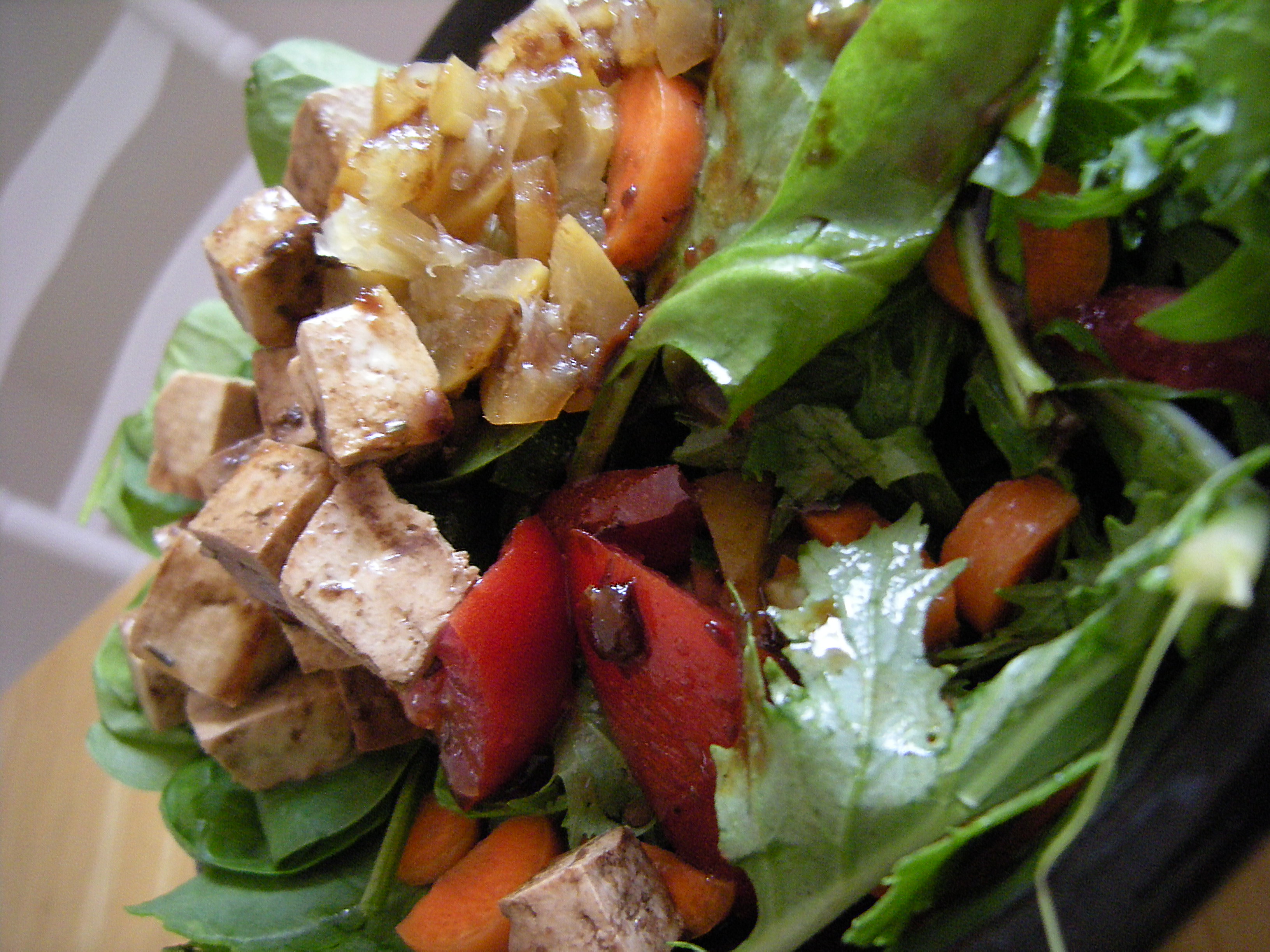 And salad topped with baked tofu, pickled lemon, and homemade balsamic vinaigrette