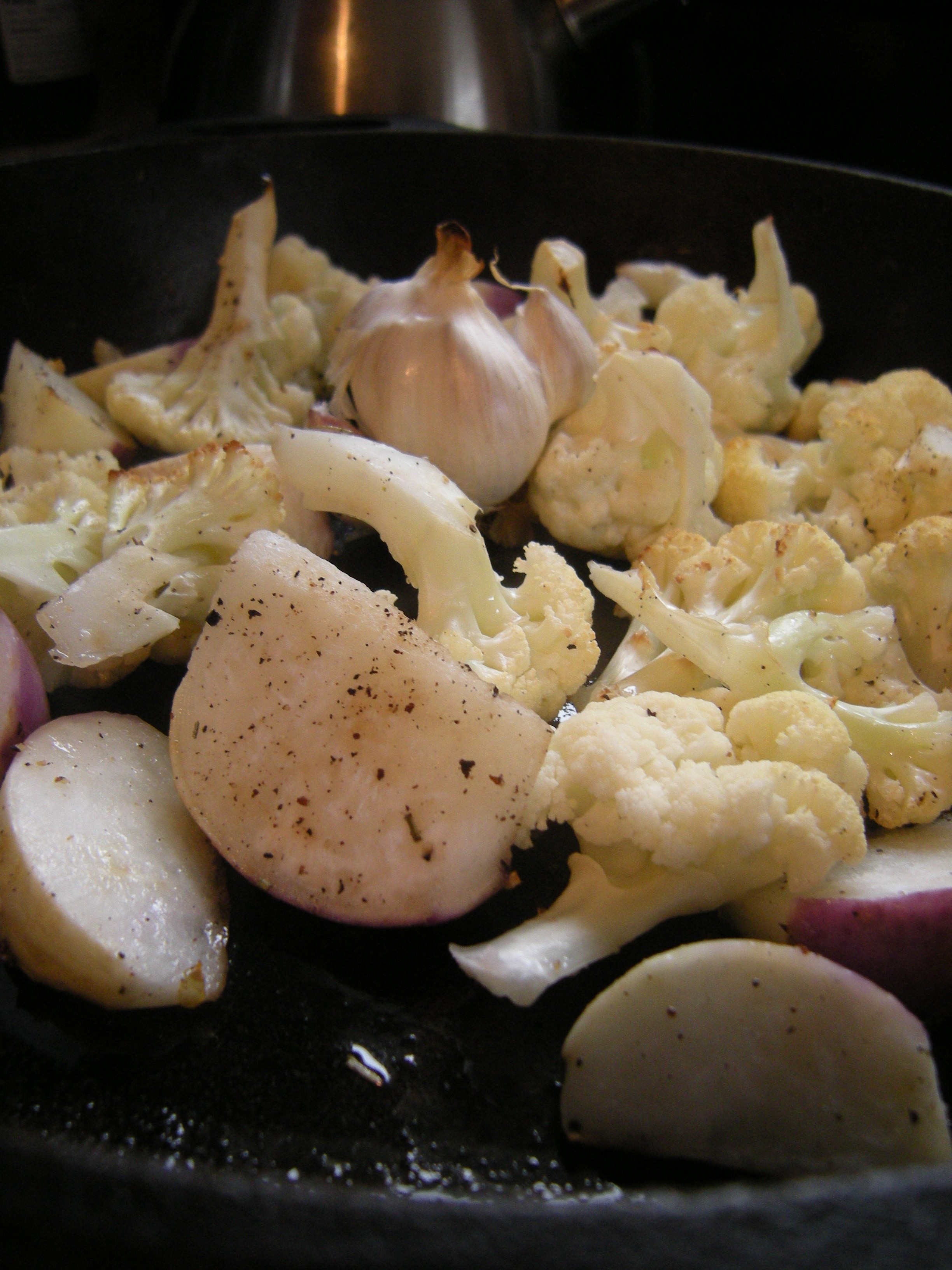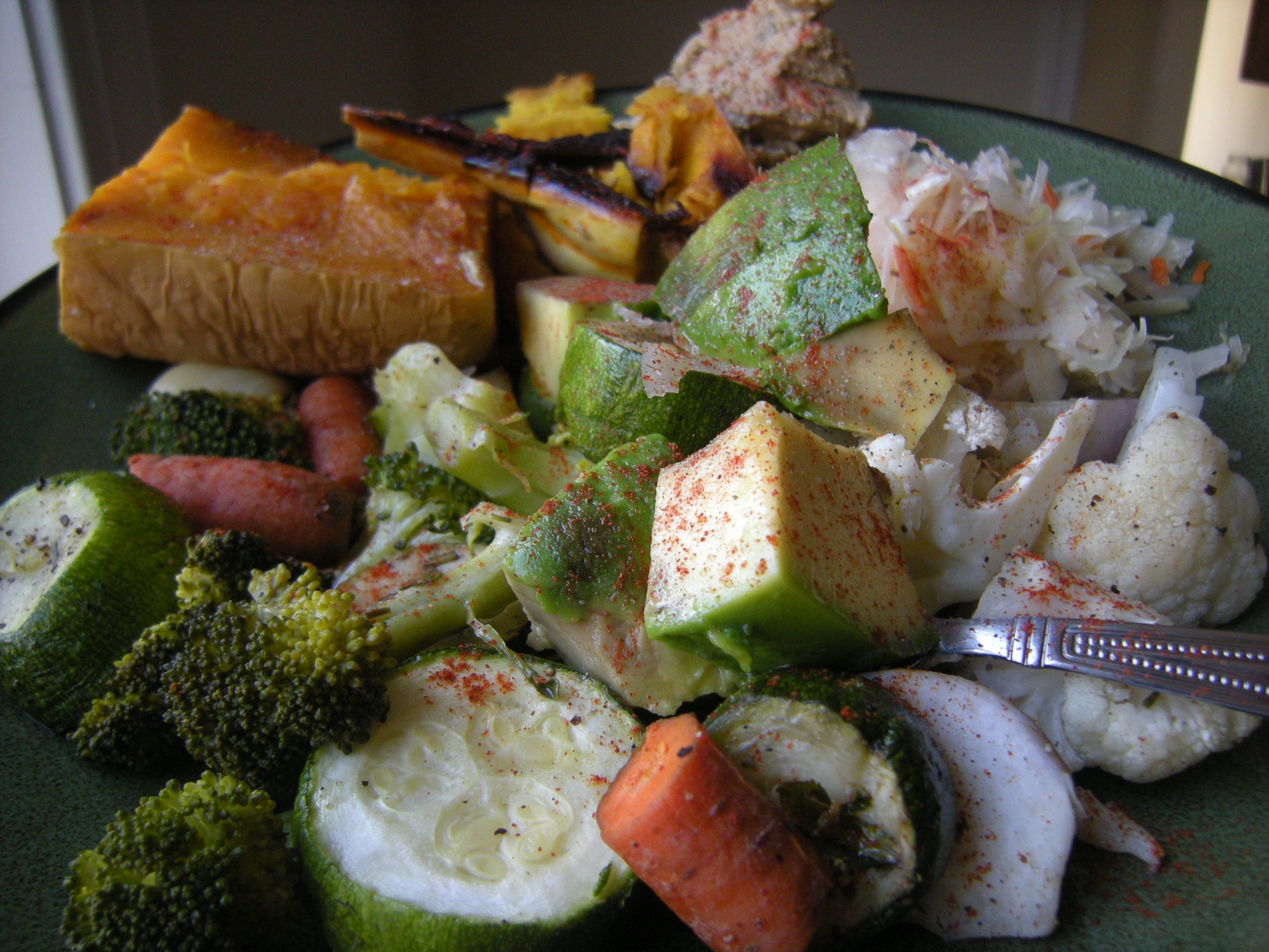 Leftover roasted butternut and delicata squash, roasted broccoli, carrots, cauliflower, and turnips, homemade sauerkraut, homemade hummus, and some avocado chunks. Wow, it was very tasty but my eyes were bigger than my appetite and I ate about 3/4 of this (large) plate.