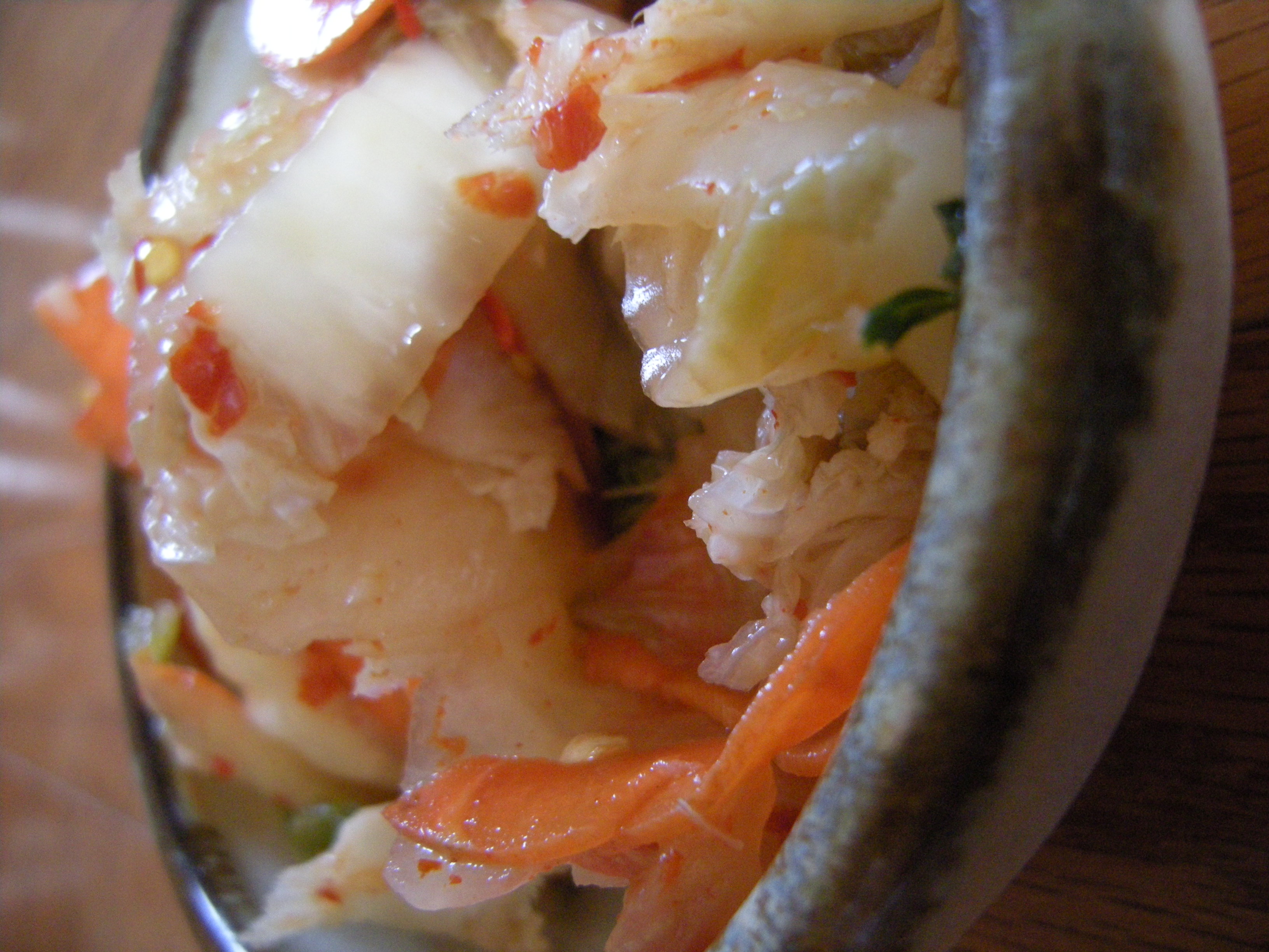 My first batch of kimchi is definitely a success! Just the right amount of salt and spice and loads of ginger. Tate dug into it for the first time a few days ago and when he went back for a second serving I told him I was so glad he liked it. His response? “Are you really? Or were you hoping to have this for yourself?” I exclaimed “no! I am thrilled you like it, it’s easy to make and very healthy. There is plenty to go around!” Husband approved! 🙂