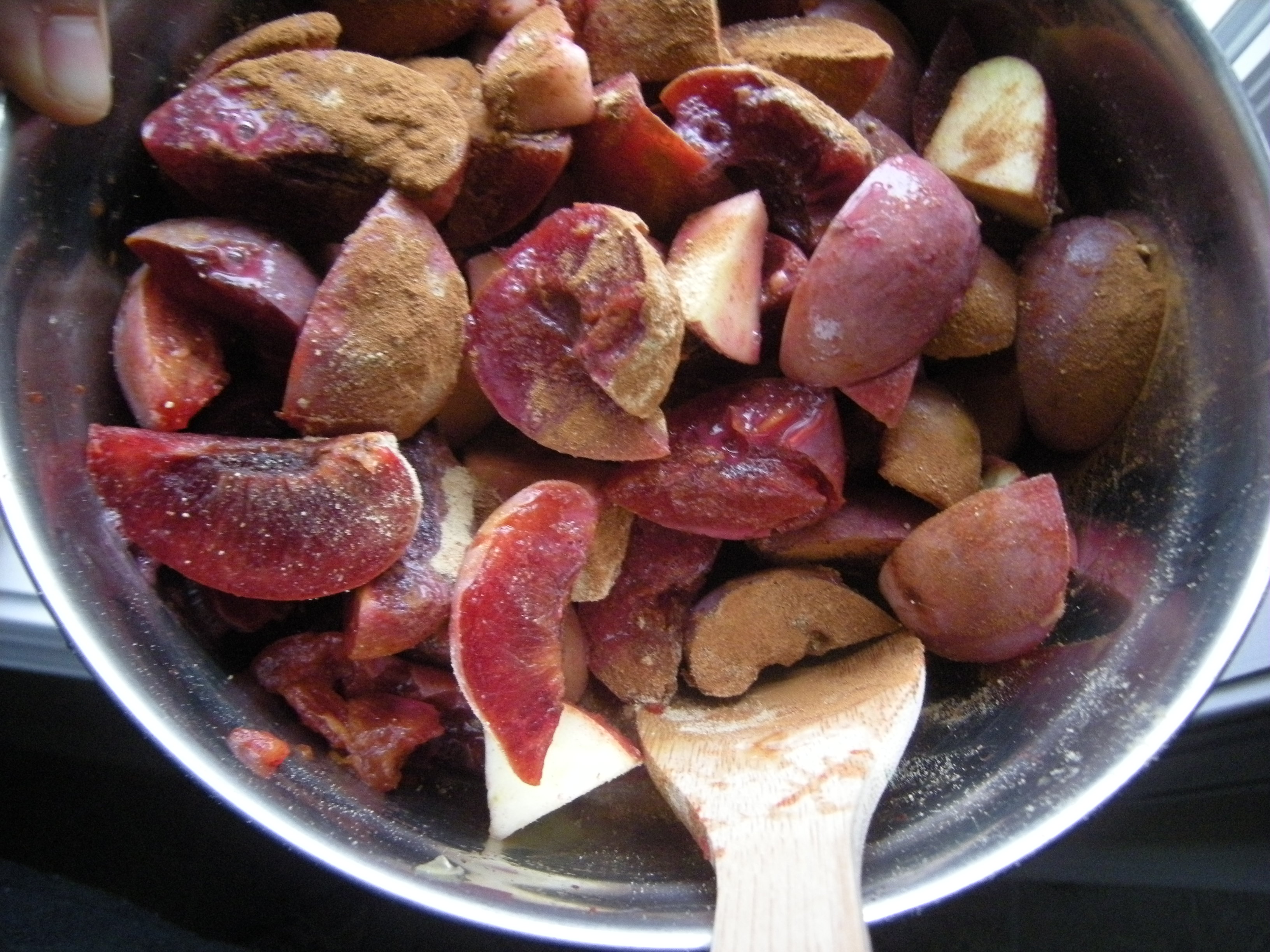 I sprinkled the fruit with cinnamon and ground ginger, added the juice mixture, and stirred it all up.