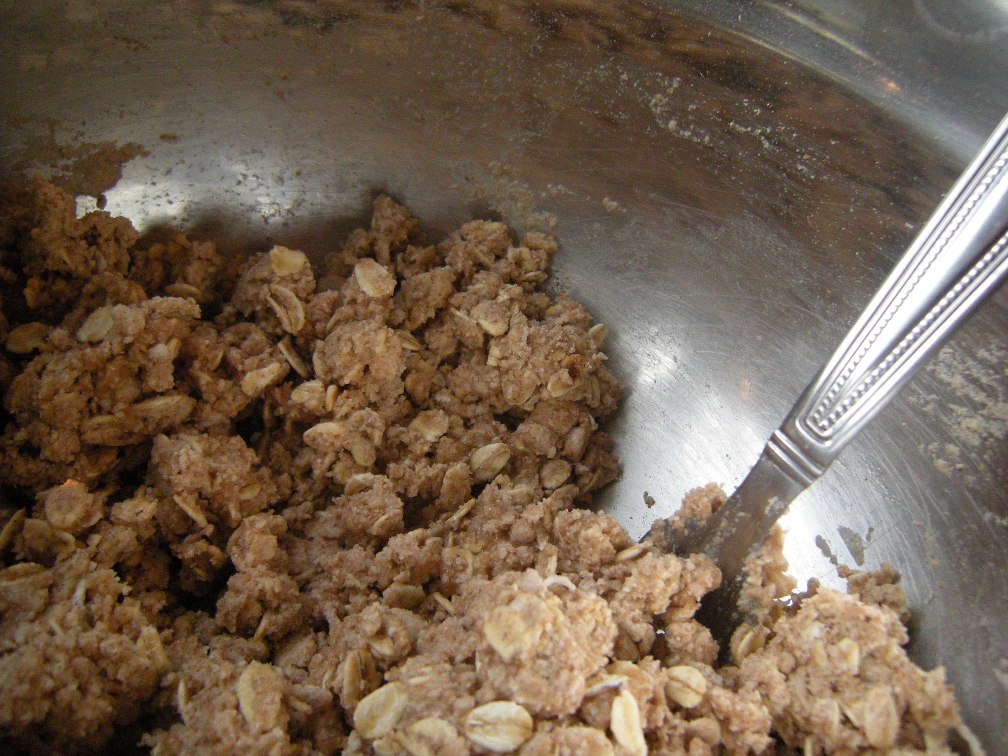 As for the topping, 1 cup of whole wheat flour, 1 cup of oats, 1/4 cup of brown sugar, cinnamon, 1/4 cup coconut oil, a 1/4 cup honey, and a few tablespoons of almond milk went into a bowl and got all mixed up.
