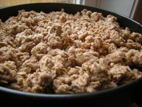 The fruit and topping went into a spring-form pan and into a 350 degree pre-heated oven.