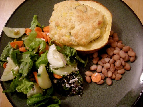 I left out the butter (by accident) and green onion (didn’t have any) and subbed in a dash of cumin and pickled jalepenos. Cheese would be pretty amazing but we were already having Feta on our salad.