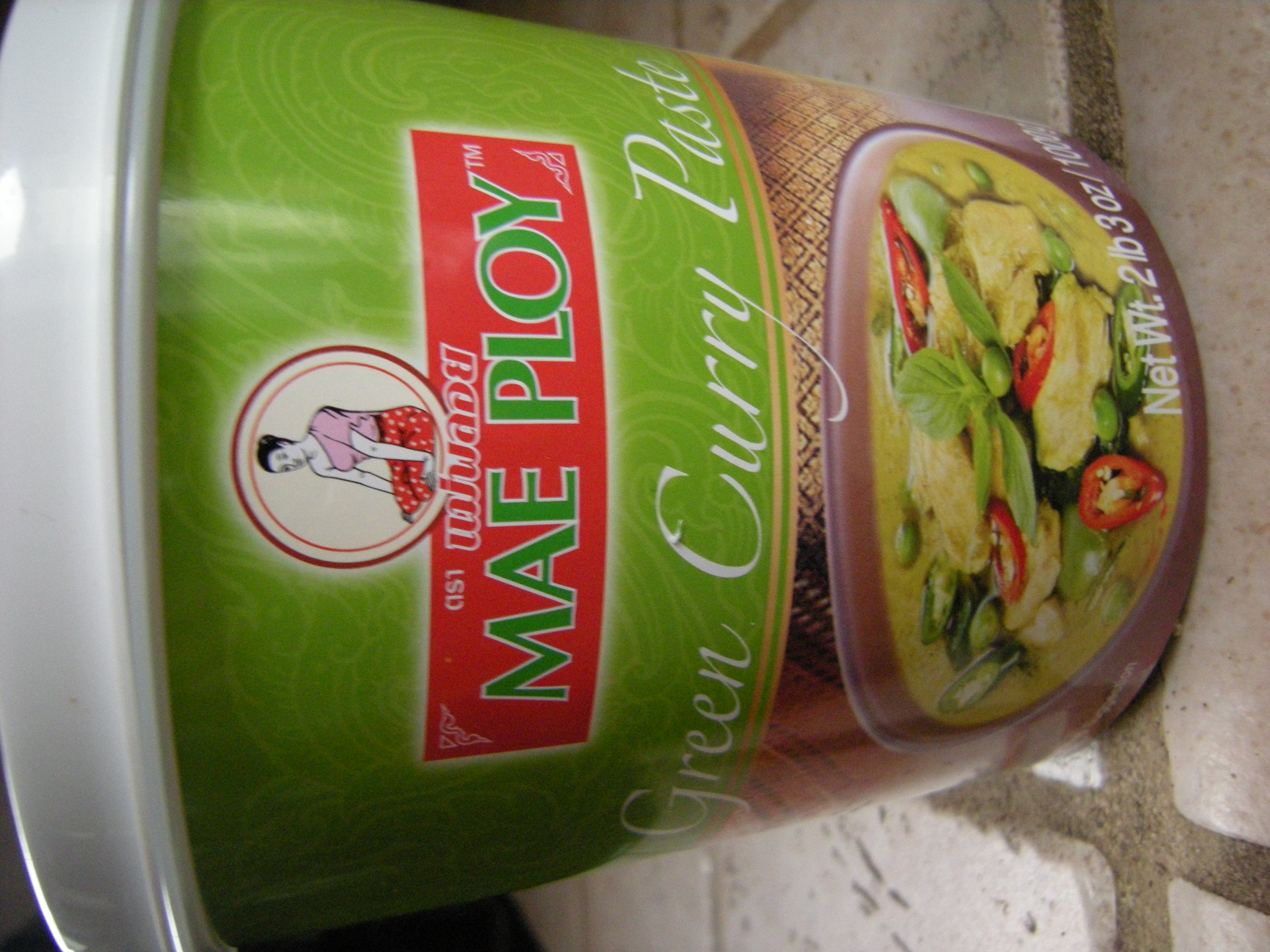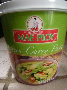 Give the mix a few good stirs.  Now comes the key ingredient, the curry!  Our favorite is this green curry paste, which can be purchased for a few bucks at most Asian groceries and a few regular grocery stores.