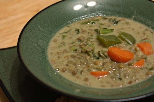Once the veggie-tofu combo starts to brown throw it all in the pot with the lentils.  To the pot add 1 can of coconut milk, and a few handfuls of chopped kale.