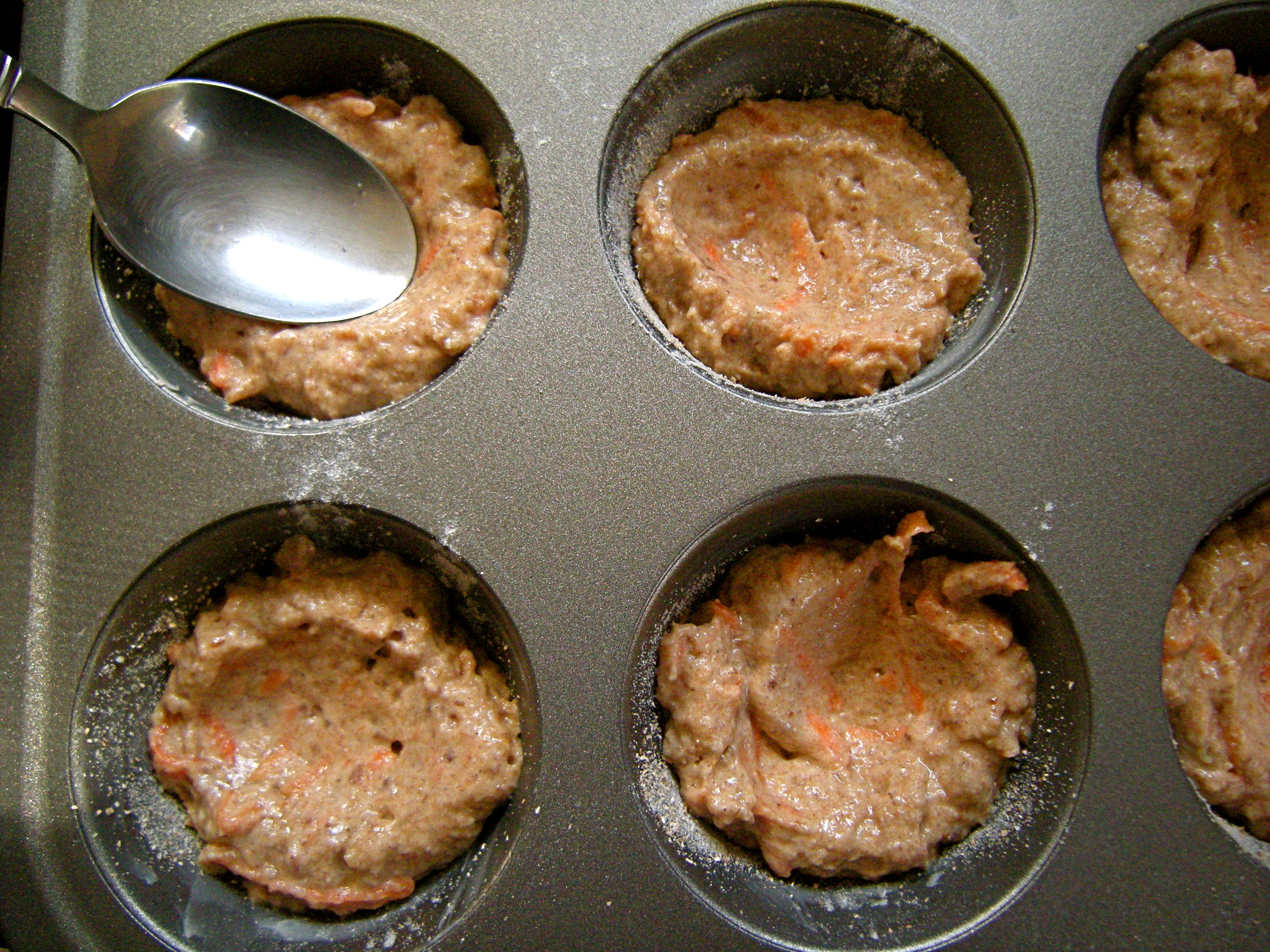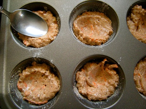 - put a heaping spoonful of batter into the bottom of each muffin cup