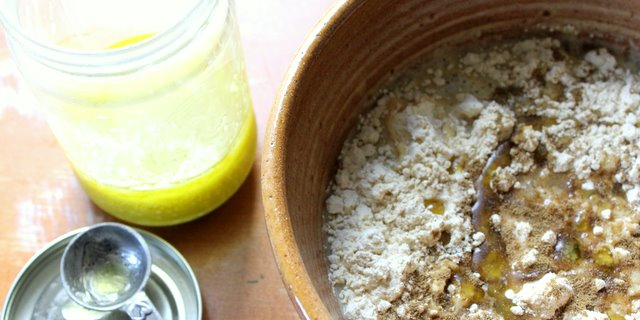 Whisk everything but 1 tablespoon of the olive oil into the flour.