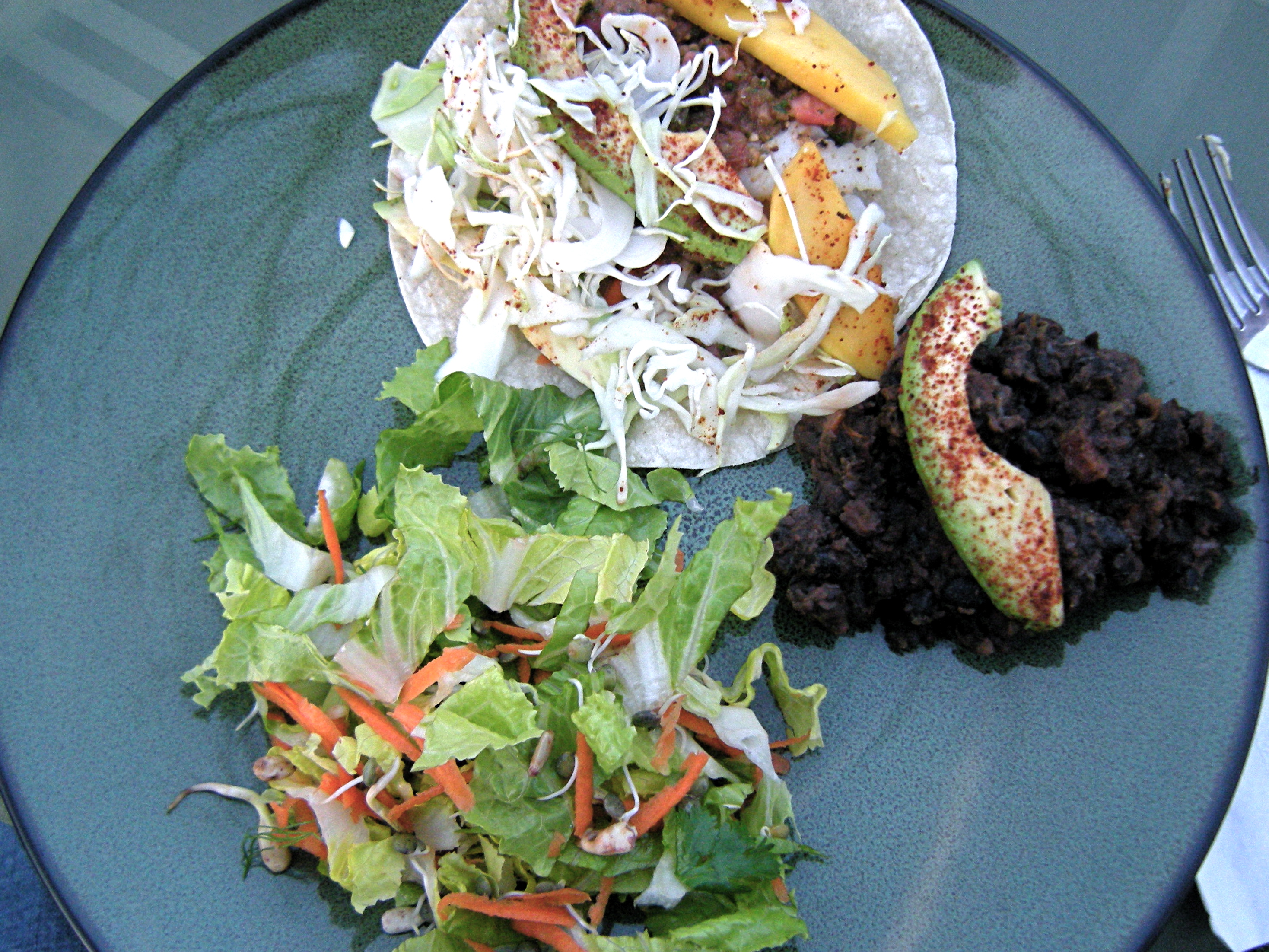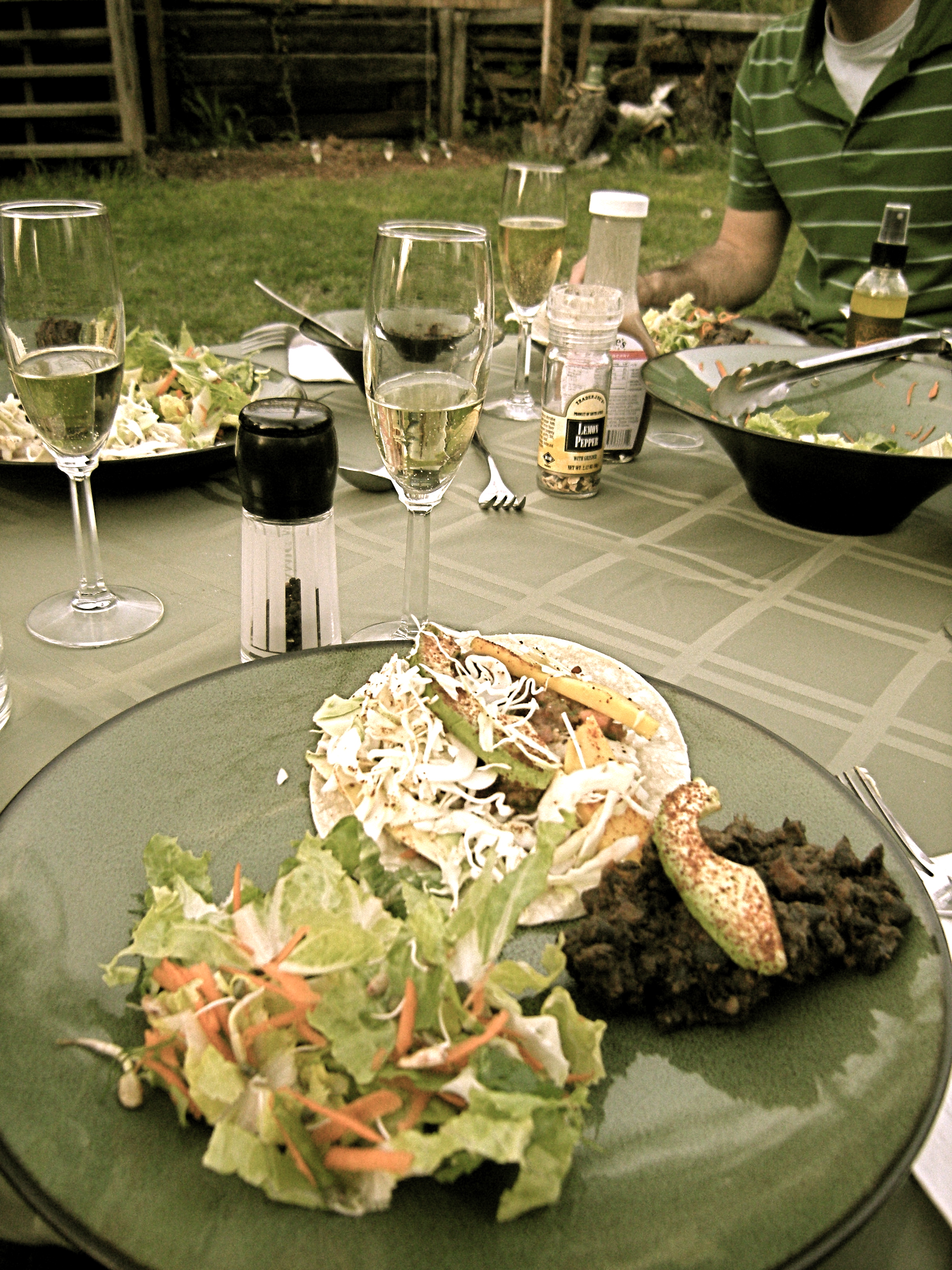 Shredded cabbage, fresh salsa, simple white fish (Flounder last night but often Tilapia), avocado, and mango all brought together in a little corn tortilla. Served with salad and sparkling wine (perhaps we should have been toasting The Donald?) this meal was all about fresh flavor.