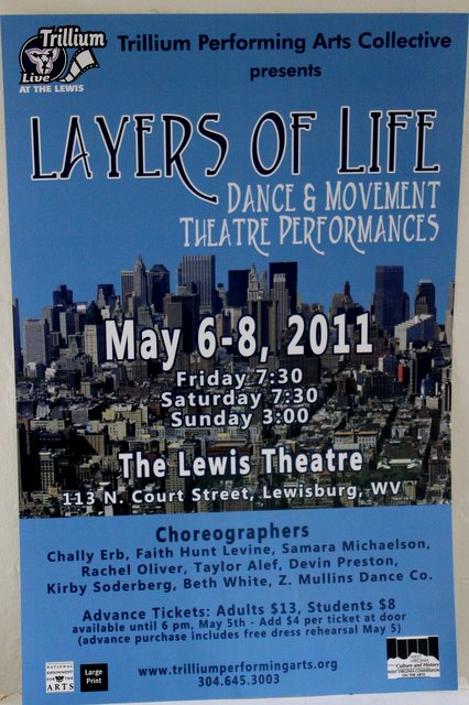 I drove over to Lewisburg on Wednesday afternoon to start technical rehearsals for Layers of Life.   After running my dance the last two nights to a small audience comprised of the rest of the cast, the crew, and a few others, I am ready for opening night!
