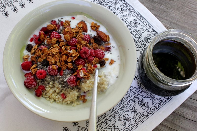 The crumbs of Wednesday’s leftover quinoa, the bottom scrapings of a jar of yogurt, frozen wineberries, chia seeds, and a sprinkle of Love Grown Foods Raisin Almond Crunch (my favorite of their granola!). Even my coffee was leftover and drank cold from the fridge.