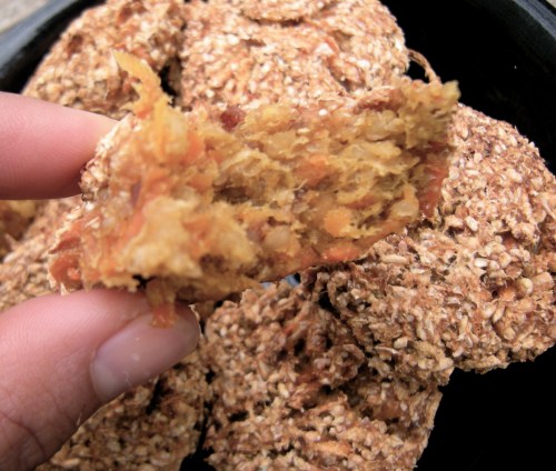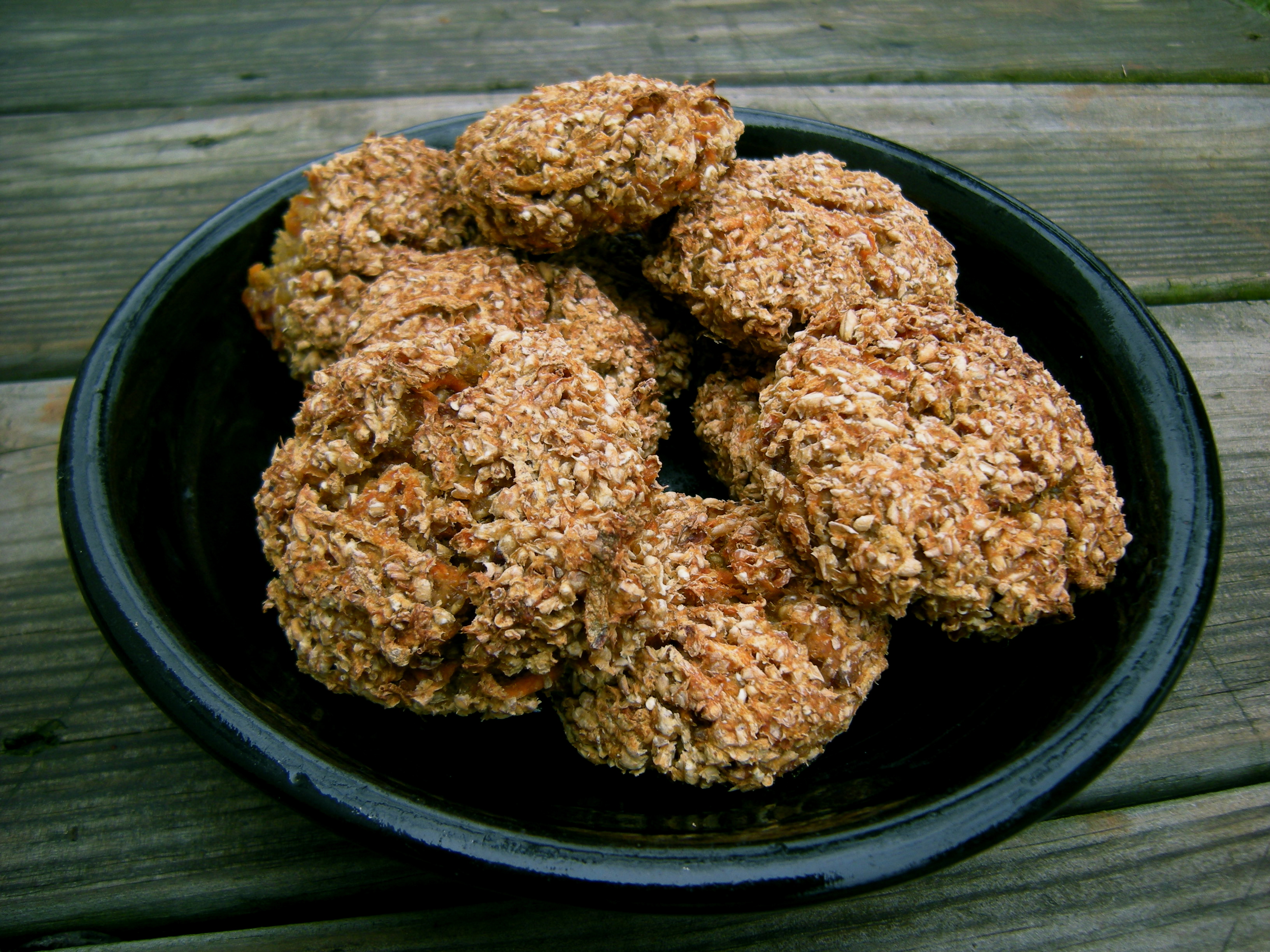 These cookies were made without an iota of a plan and sadly they kind of taste like that. I had a little bit of applesauce and some extra shredded carrots (from the manna) so into the food processor they went. An impulse buy of $2 a jar organic almond butter has left me with a plethora of my least favorite kind of nut butter so in went a few big spoonfuls. Honey, a little bit of sugar, lots of cinnimon and a few grates of nutmeg, some eggs, oh wait they need something more…oats to the rescue.
