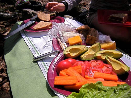 Super seedy and delicious Great Harvest Dekota bread, three kinds of cheese and lots of veg.
