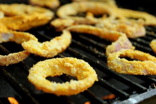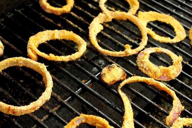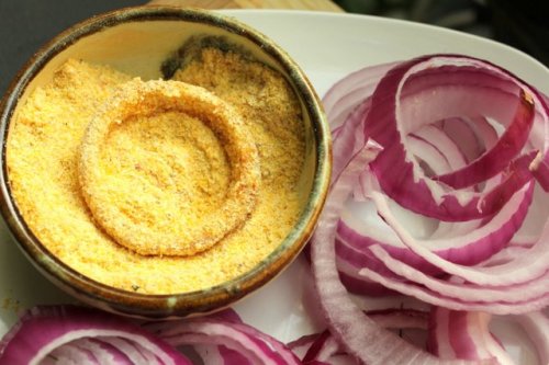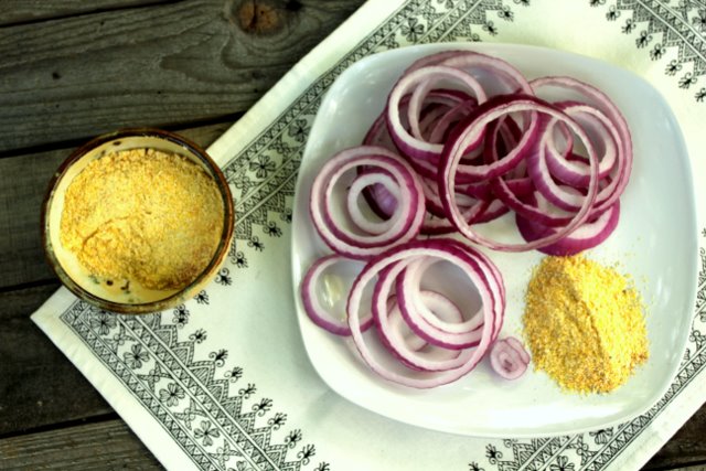 Each ring was dipped in an egg wash (1 beaten egg) then dredged with spiced cornmeal.