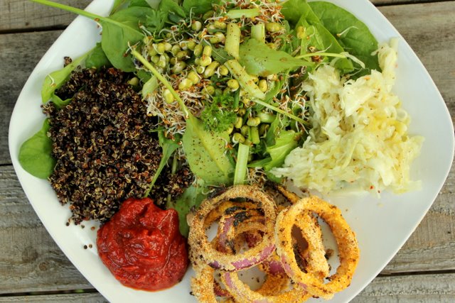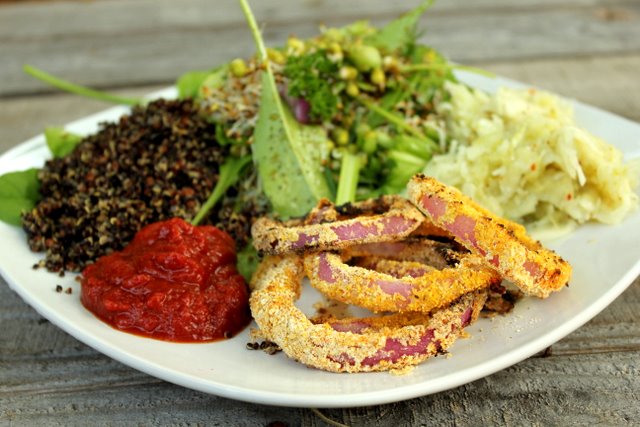 I served the crunchy rings with some homemade ketchup, garden picked salad, sauerkraut, and quinoa.