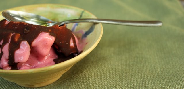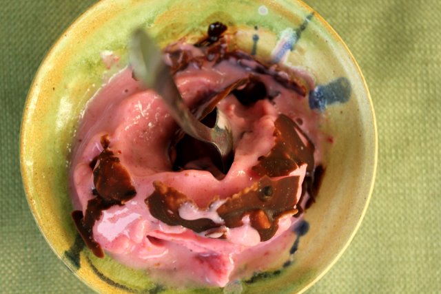 Organic frozen strawberries purred with a splash of soy-milk and topped with chocolate-coconut magic shell. My magic shell consisted of liquid coconut oil, a spoon of peanut butter, cocoa, stevia, and a splash of vanilla. I made a big batch (4 ounces?) and stored the leftover in a jar. Cannot wait to try it over purred frozen banana!