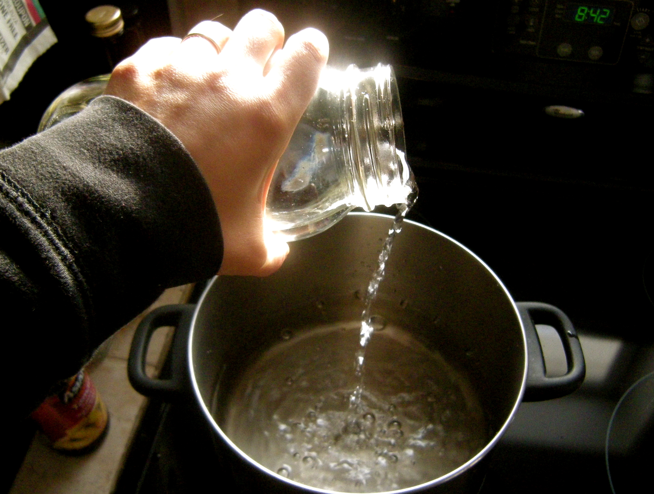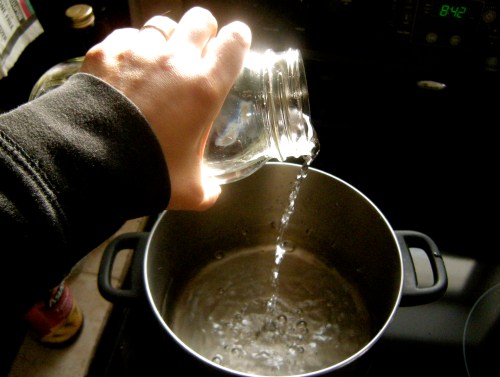 The chlorine of tap water and the charcoal of filtered water is bad for the (healthy) bacteria in the grains so I start by boiling just under 4 quarts of water (the size of my brewing container).