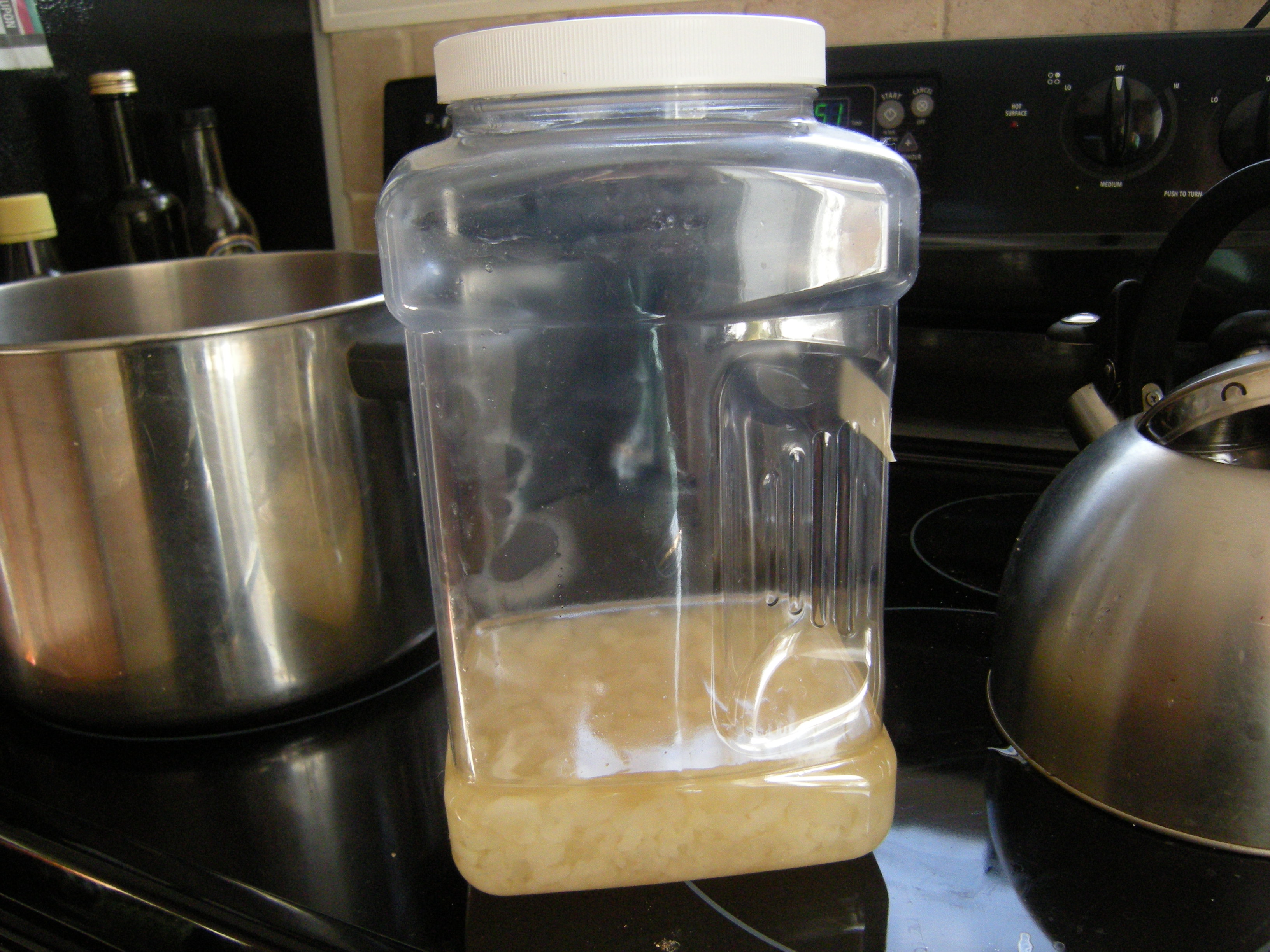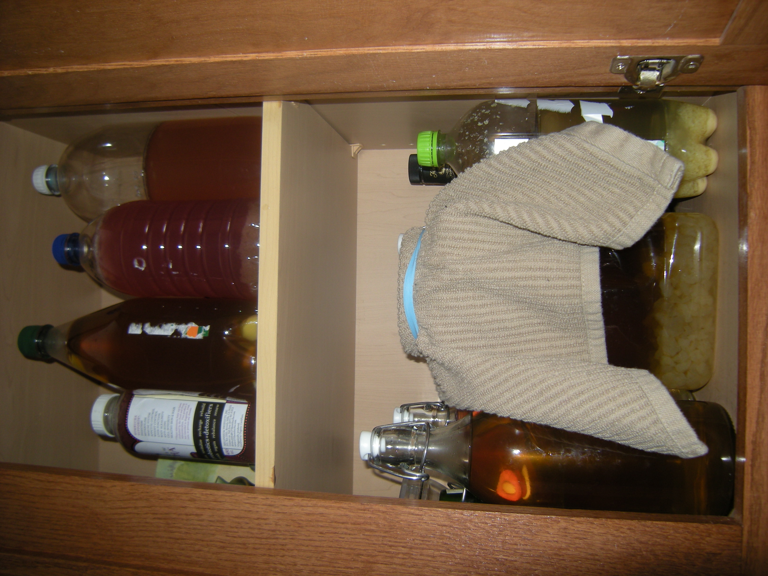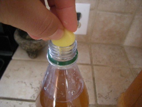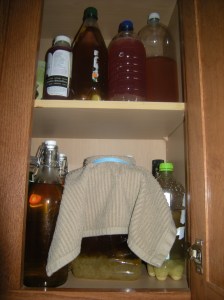 Screw the lid on tight and into the cabinet it goes! I will check the fizz after 2-3 days. Our kitchen stays pretty cool so it seems to take about 5 days for a nice amount of fizz to build up.