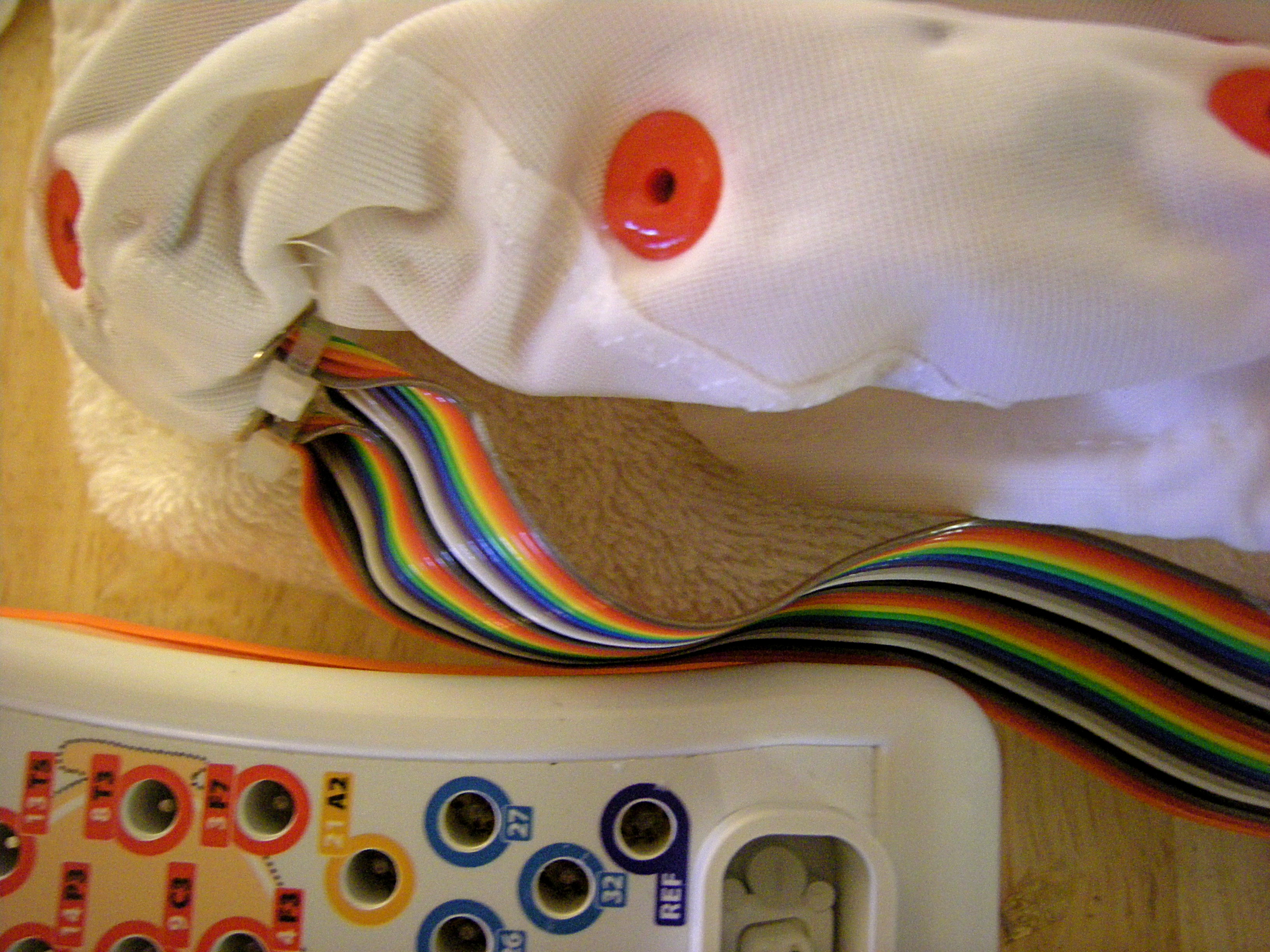 The red dots changed color on the monitor when contact was made. (Yep, that pink blob on the top of the screen is “my” nose! :/)