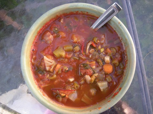 Homemade canned garden vegetable soup from that day of domestic madness back in August with 1/2 a cup of mung beans and some sharp cheddar thrown in for protein.
