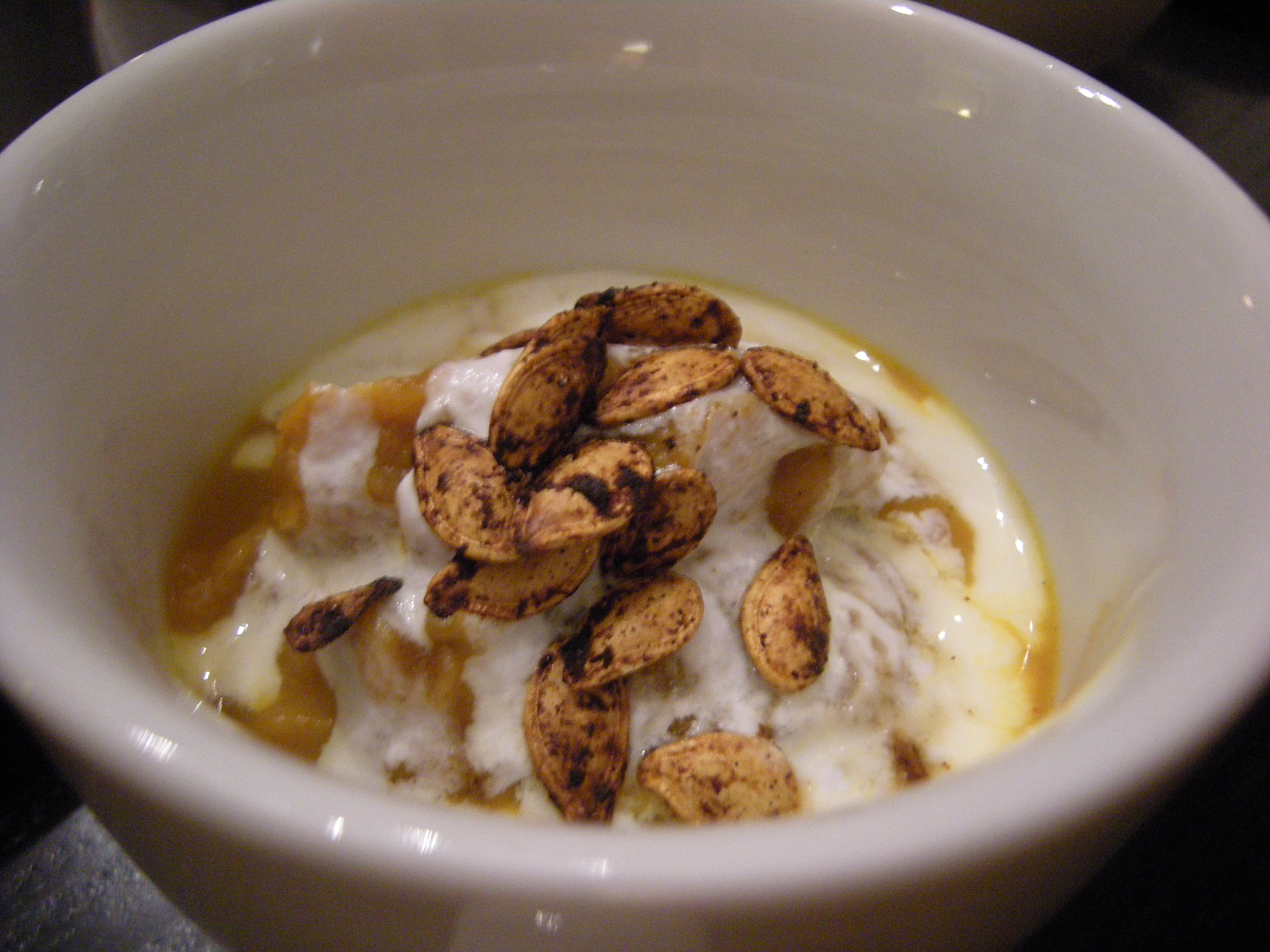 I made pumpkin soup, garnished with yogurt, maple syrup, and pumpkin seeds.