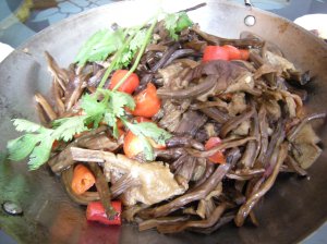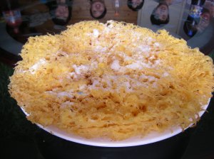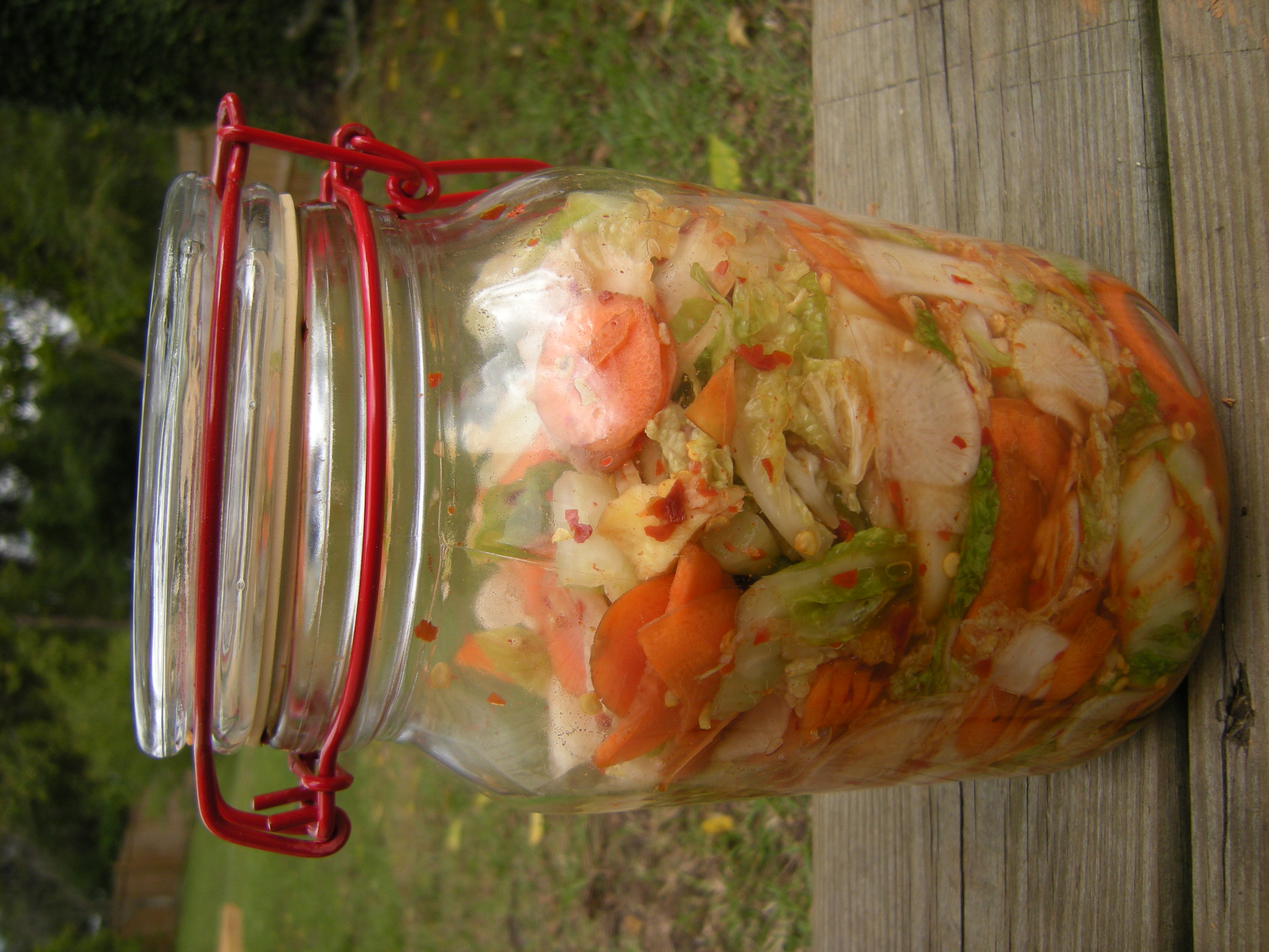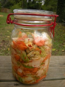 Kimchi is a spicy fermented salad or condiment from Korea made with Napa cabbage, garlic, ginger, salt (which is what ferments it), and some form of hot pepper. I also added carrots and daikon radish to this batch. This jar is sitting on my pantry shelf fermenting as I type but on Friday it will be ready to taste and from then on it will live in the fridge until it’s all gobbled up.