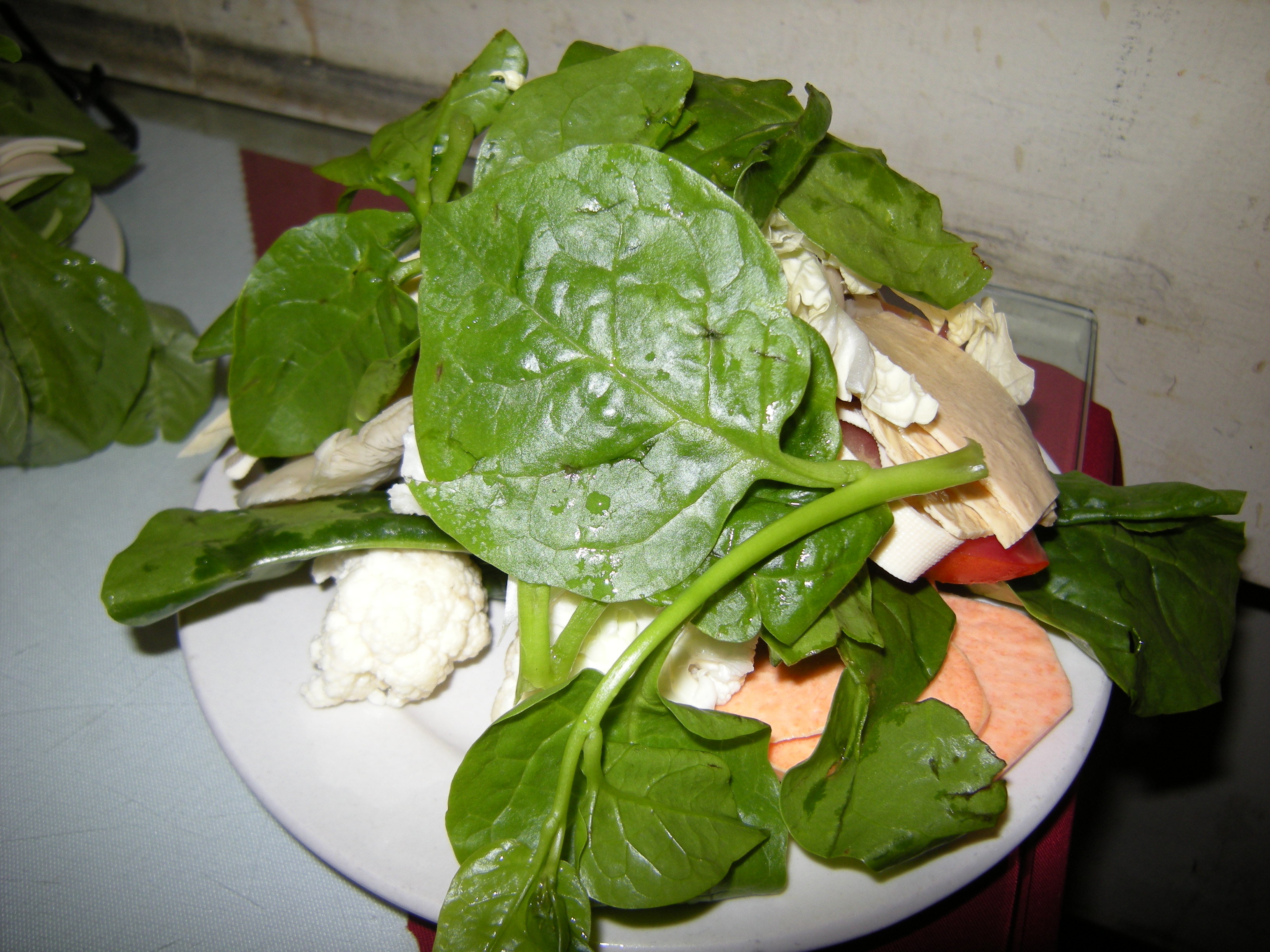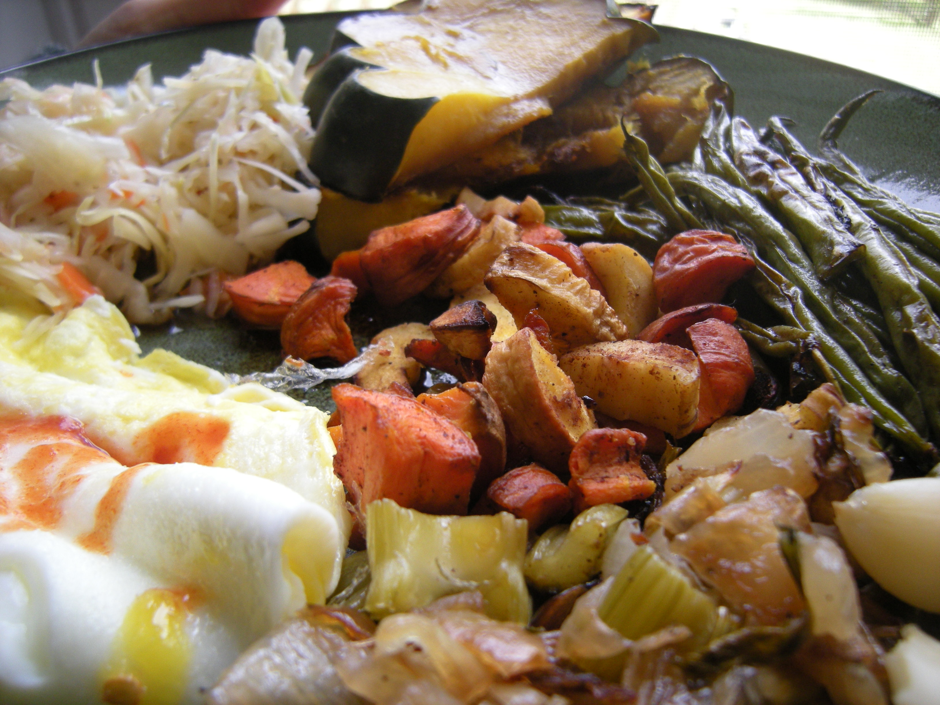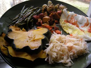 I added a fried egg with hot sauce for protein and some homemade sauerkraut for raw food and a dose of probiotics. My first batch of sauerkraut is delicious by the way! I have never been one to eat sauerkraut regularly but after hearing so many praises about the health benefits of fermented foods I am happy to eat a couple spoonfuls with lunch (and it really is quite tasty).