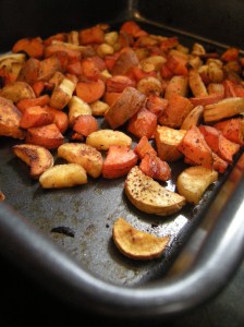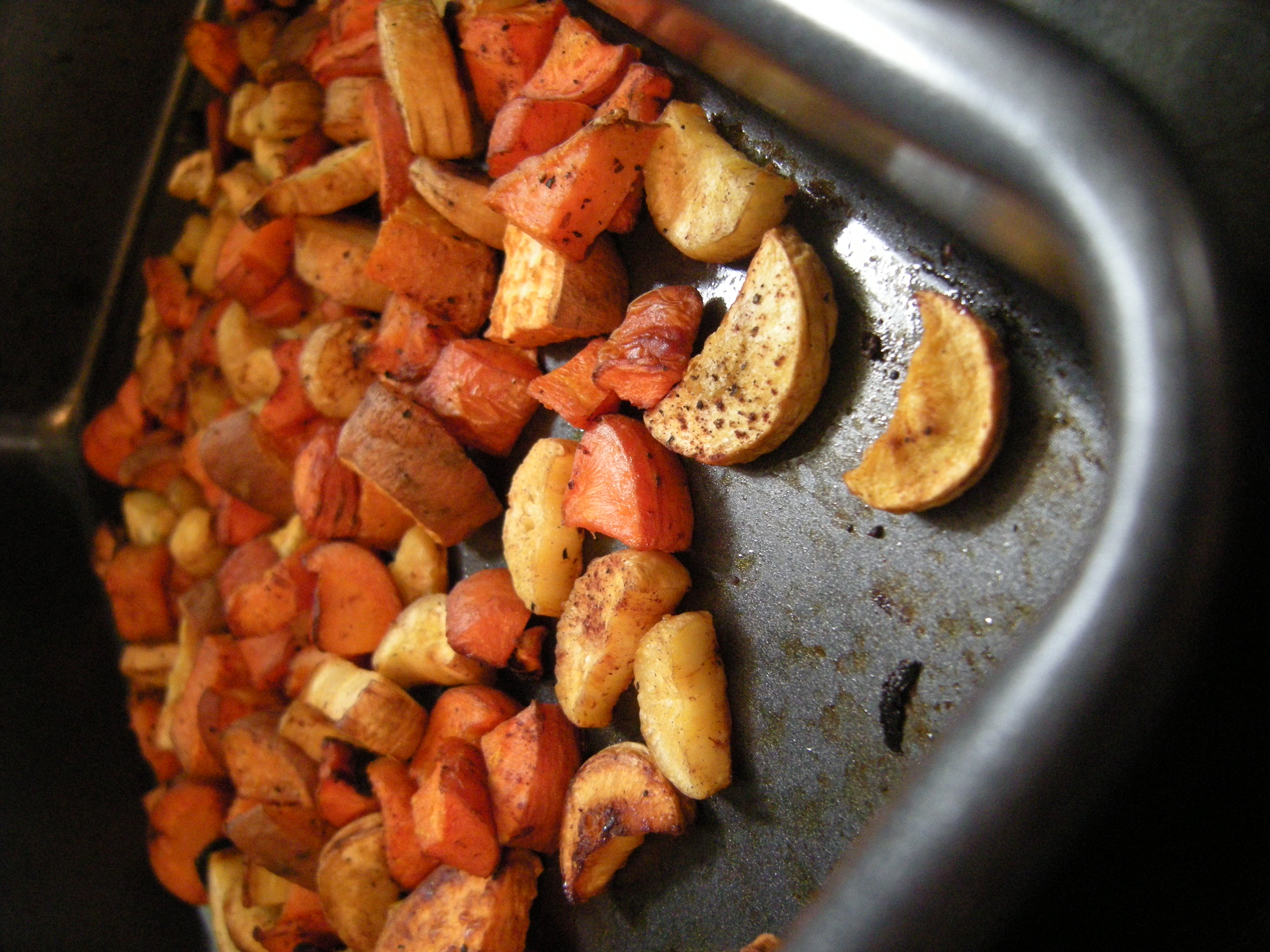 Carrots, parsnips, and sweet potato dusted with cinnamon and cayenne