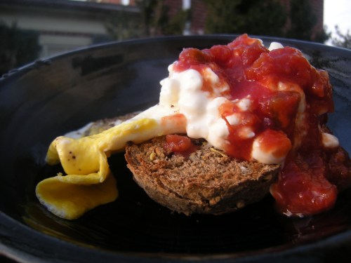 A thick slice of toasted homemade whole wheat, a fried egg, cottage cheese, and salsa! Love me some protein! I ate this breakfast minus the egg yesterday and it kept me going for hours and hours.