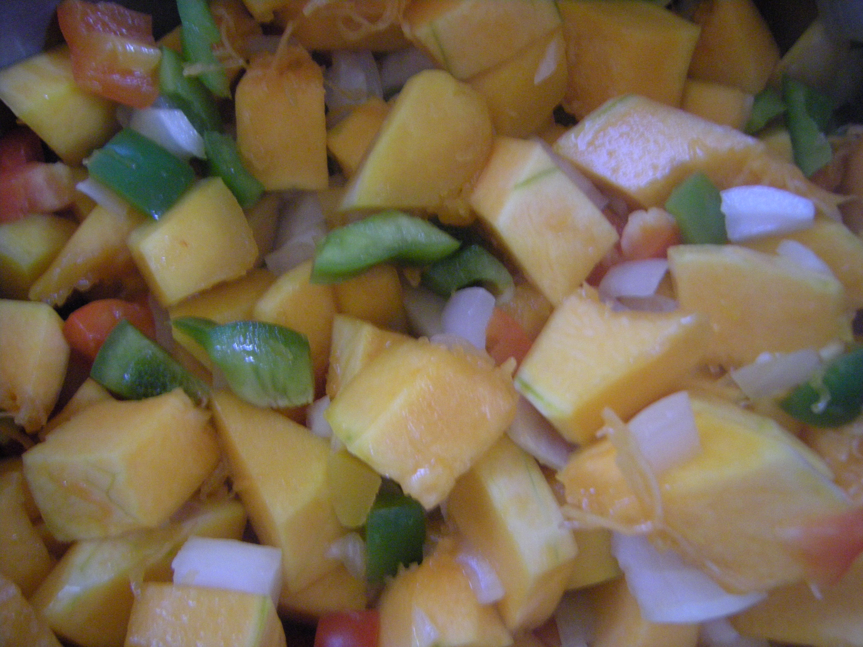 I peeled it and chopped it up and put it in a pot with chopped onion, 2 bell peppers, and a bit of olive oil.