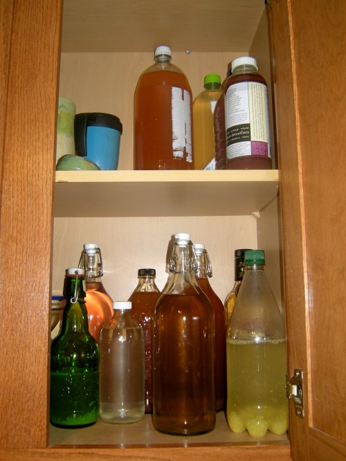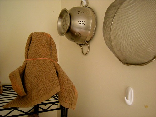 Covered with a clean dish towel (to keep it clean) and set in the pantry to work it’s fermenting magic.