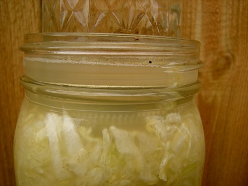 I’ll check the ‘kraut every few days and will put and lid on it, put it in the fridge, and start to eat off of it in about a week.
