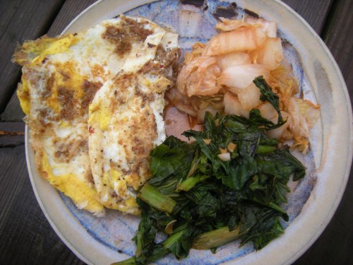 Eggs and soysauge, kimchi, balsamic-garlic turnip greens. Yum. I took a clue from Kath and drizzled a tiny tiny bit of maple syrup on the greens. Yum.