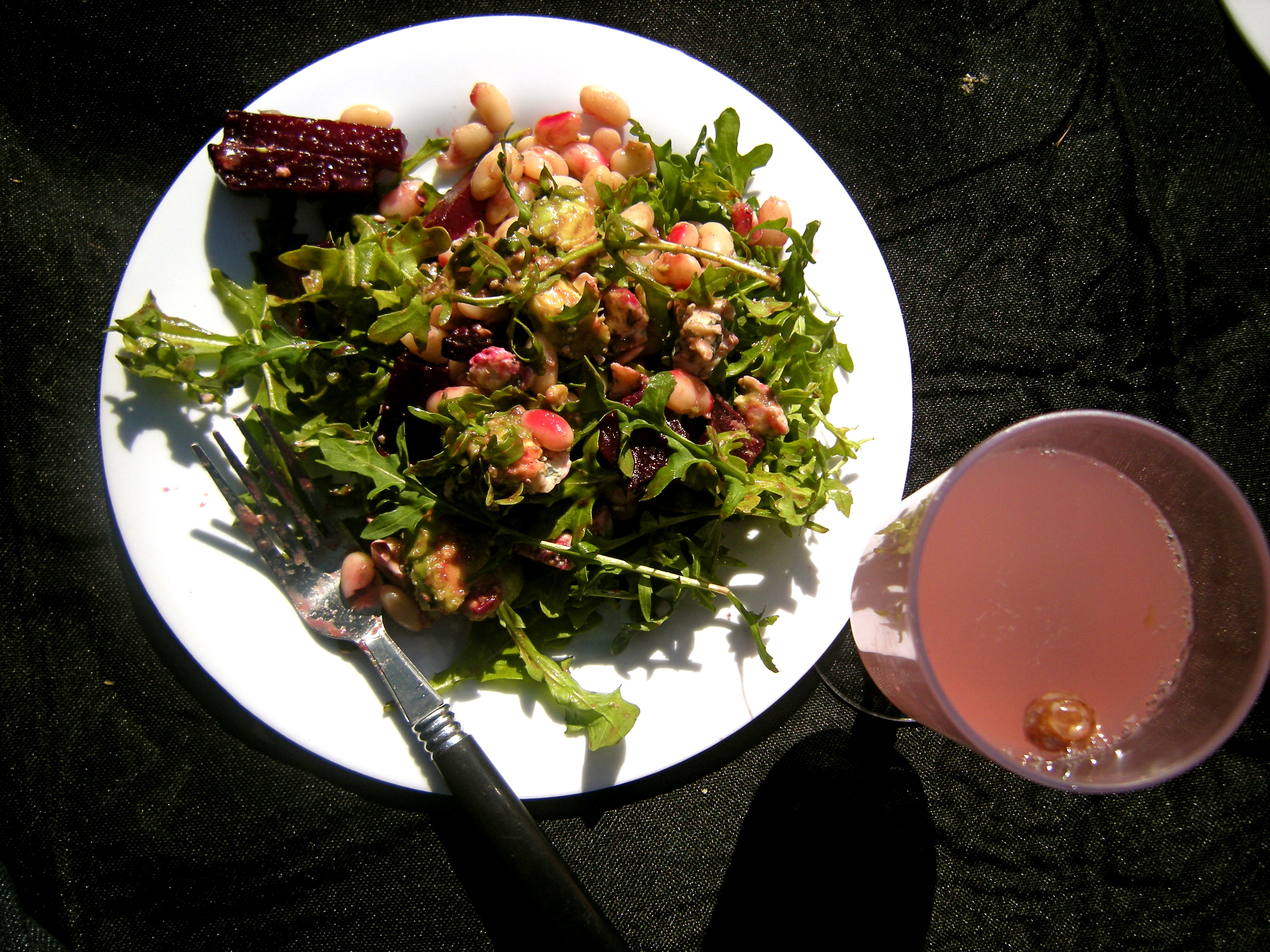 This salad rocked. Arugula, white beans, beets, gorgonzola, and avocado dressed with Newman’s Own Low Fat Rasberry Walnut Balsamic, served with Grape Kefir Soda.