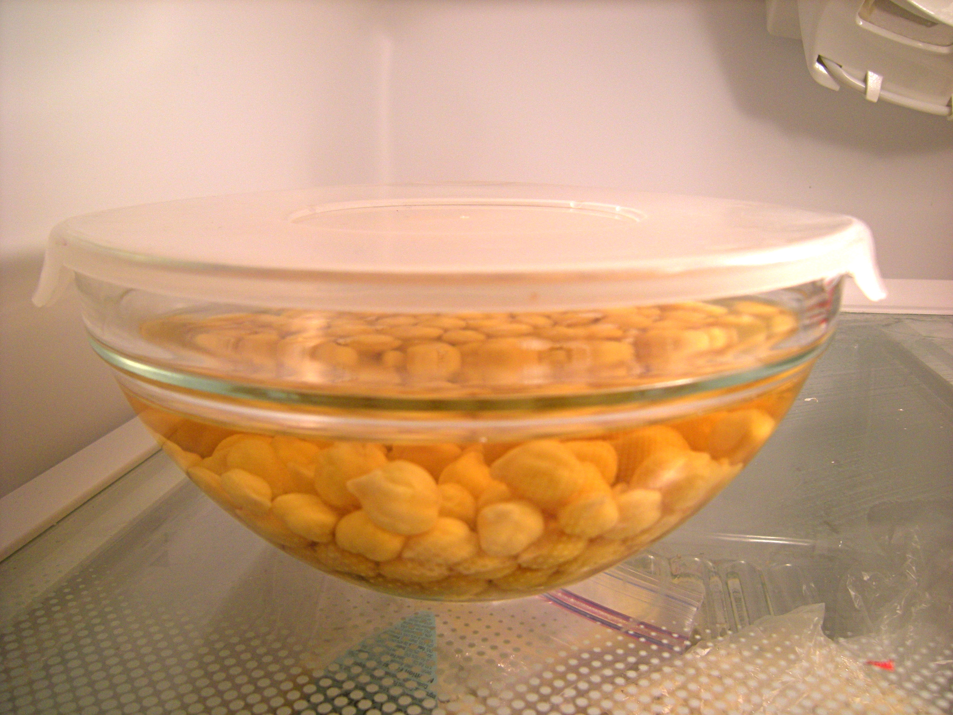 Place dry beans in a container, cover plus a few inches with water, place in fridge or on counter for at least 12 hours, preferably 24 or more. If you are soaking for longer than 24 hours I recommend putting your soaking beans in the fridge. I often soak for days, I think those garbanzos have been in there since Wednesday. The longer the soak the quicker the cooking time (and less gas-inducing complex sugars!). Black beans can cook in as little as 20 minutes after a long soak.