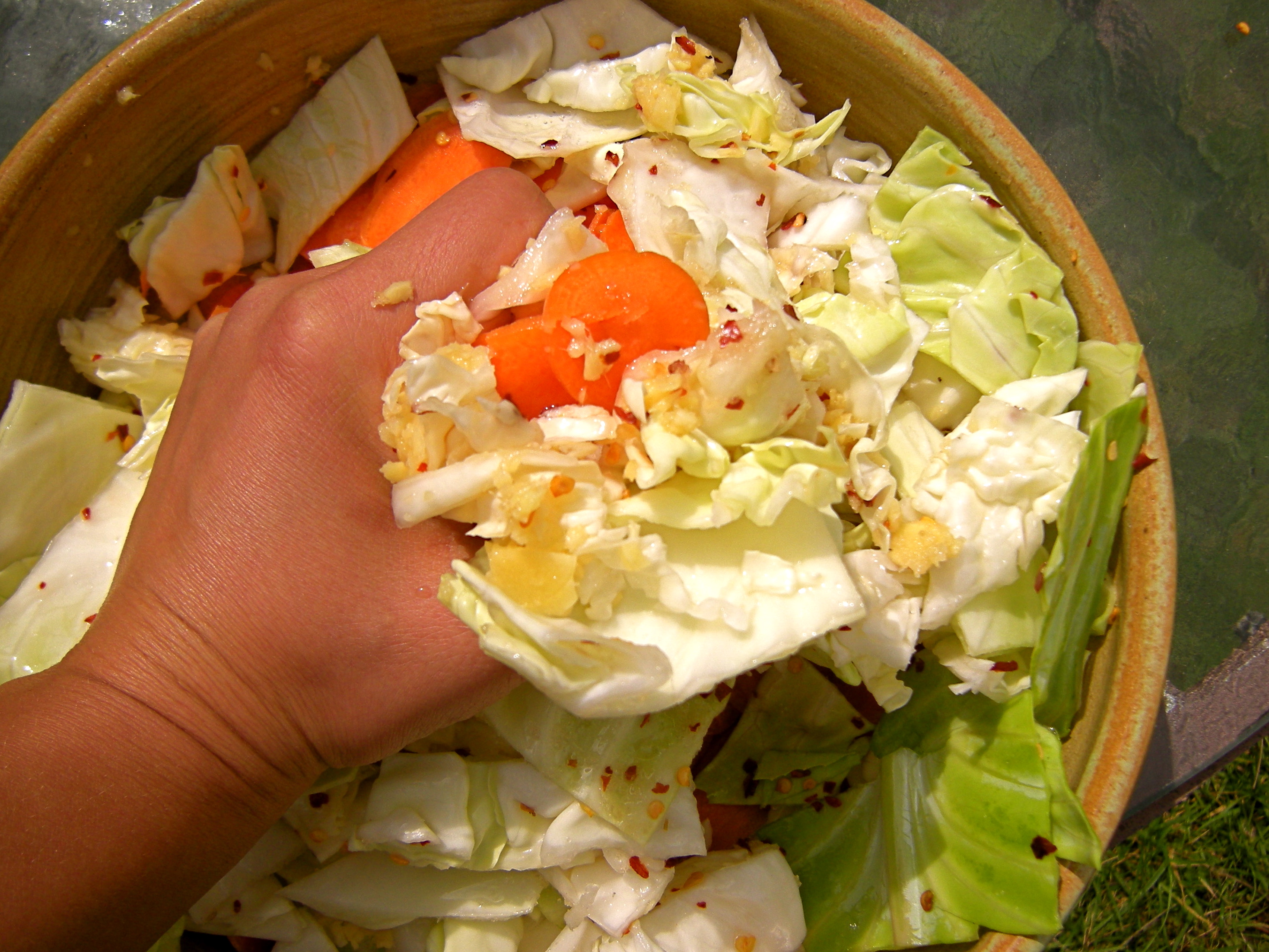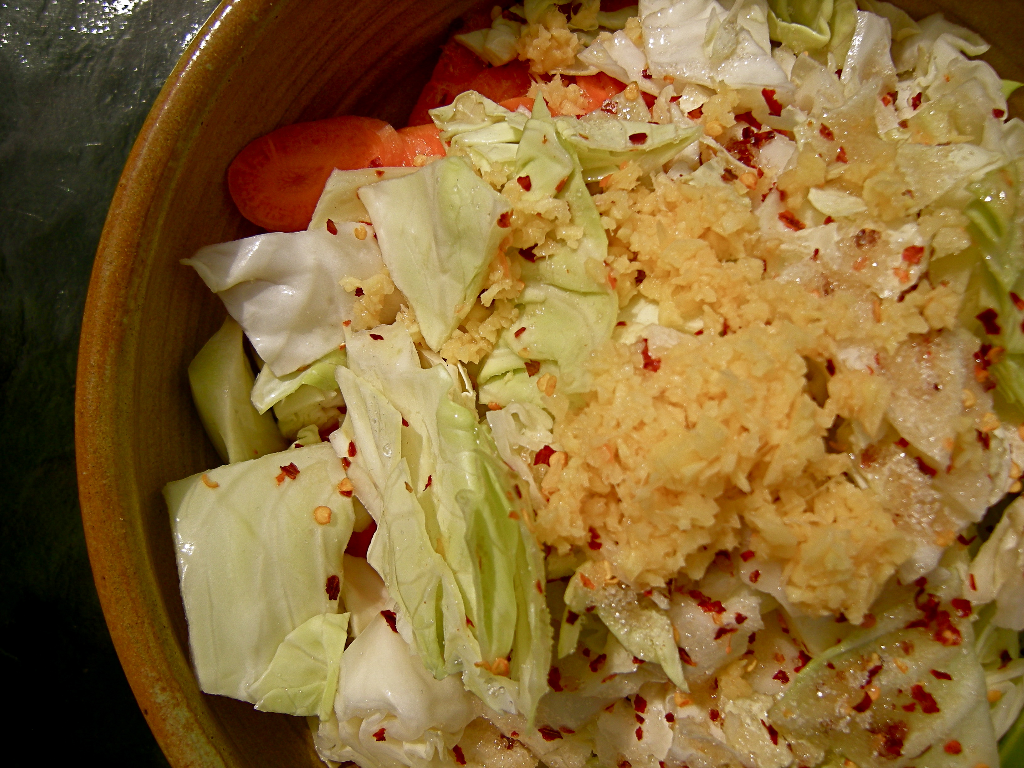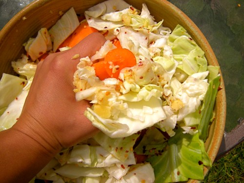 I chopped the cabbage and soaked it in salt water overnight. This afternoon I strained the cabbage and add to it thinly sliced carrots (in the food processor), grated ginger, more salt, red chili flakes, and a spoon of sugar.