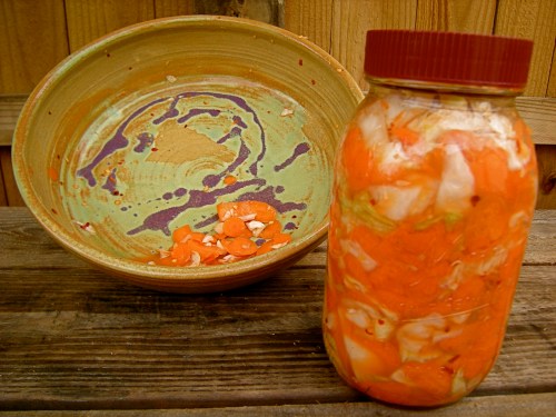 A few nights ago I was served a really lovely, wholesome meal by my friend Shawna. Along with fish, greens, and black rice, she set out sides of green cabbage kimchi and ginger carrot salad.