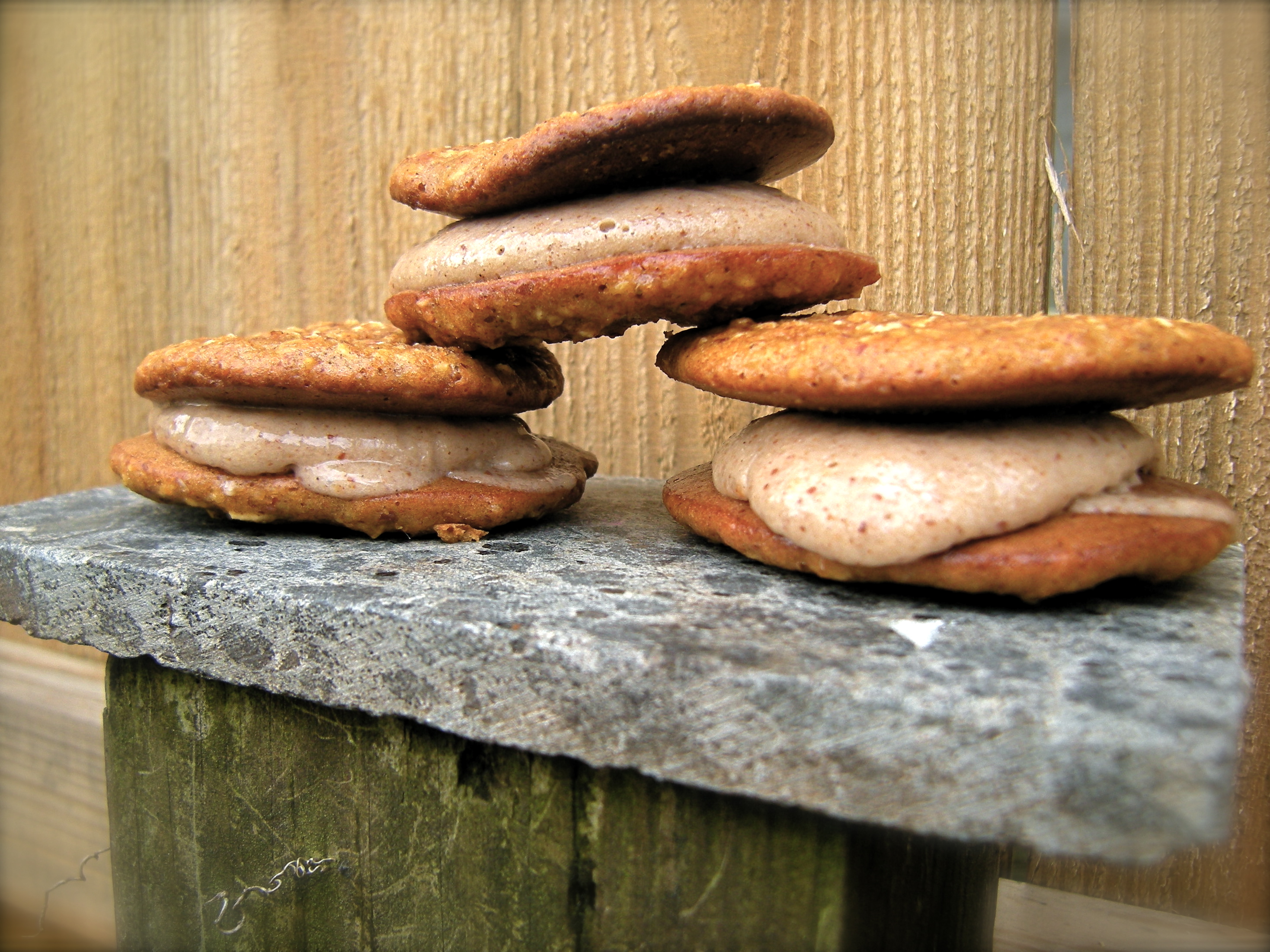 We don’t really eat a lot of ice cream around here and I wasn’t going to make a special purchase just to fill a few mediocre cookies so I rummaged around and came up with a Cinnanut Banana Cream filling. Into the food processor went 1 banana, a generous sprinkle of cinnamon, and a tablespoon of almond butter. Once it was nice and smooth I put the whole thing in the freezer-well not the whole thing but you know, the canister or whatever you call the mixing bowl part of a food processor.