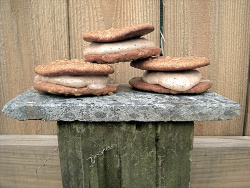 After 10-15 minutes the “cream” was thick enough to dollop onto the cookie bottoms, top with another, and put the sandwiches back into the freezer on a plate covered with a plastic bag. One was intercepted by Tate as he headed out the door to go for a bike ride and I believe I heard “delicious…” in his wake.