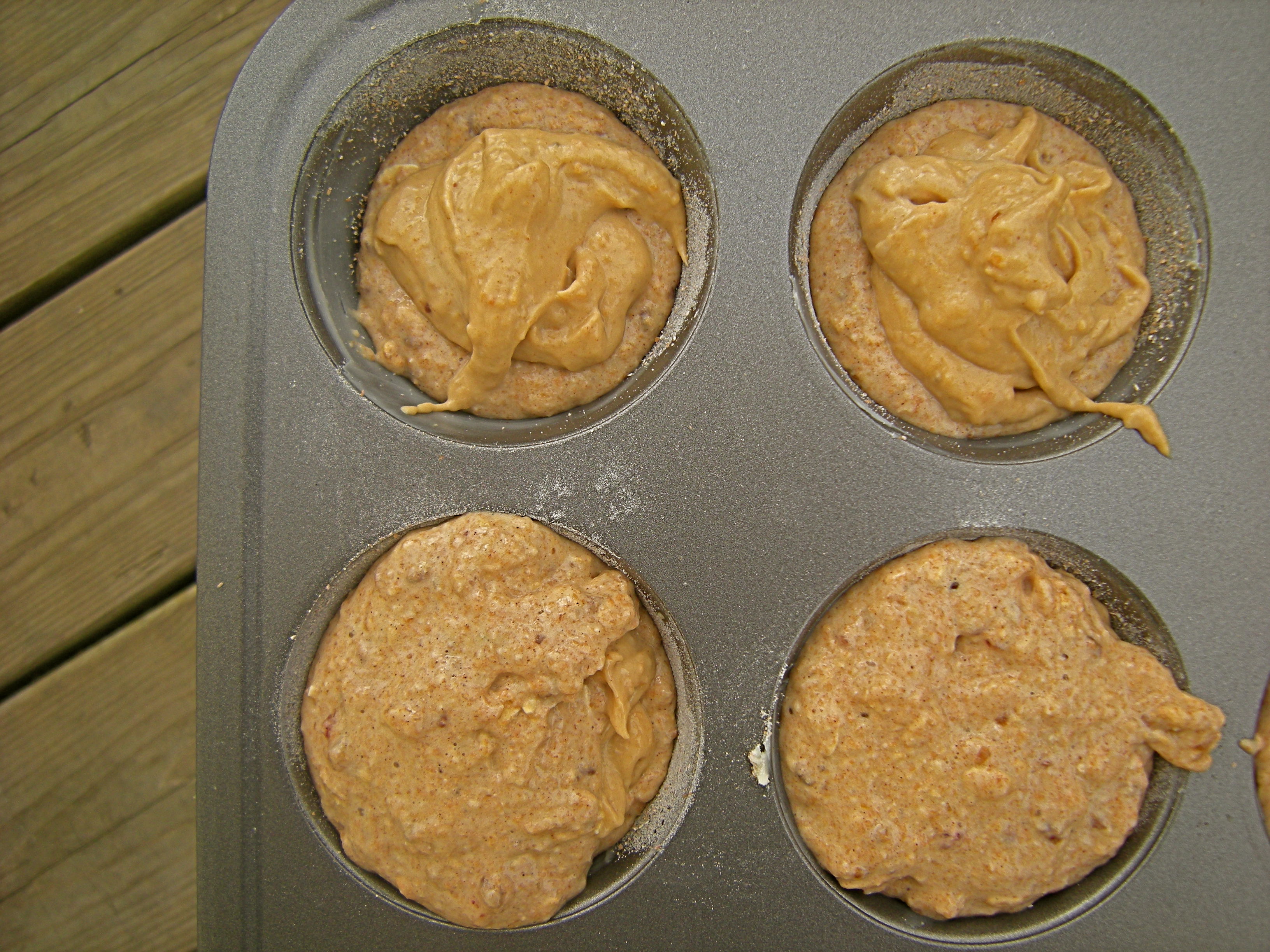 Step 2: Blob a heaping tablespoon of the pb-banana filling into the center of each cup of batter.