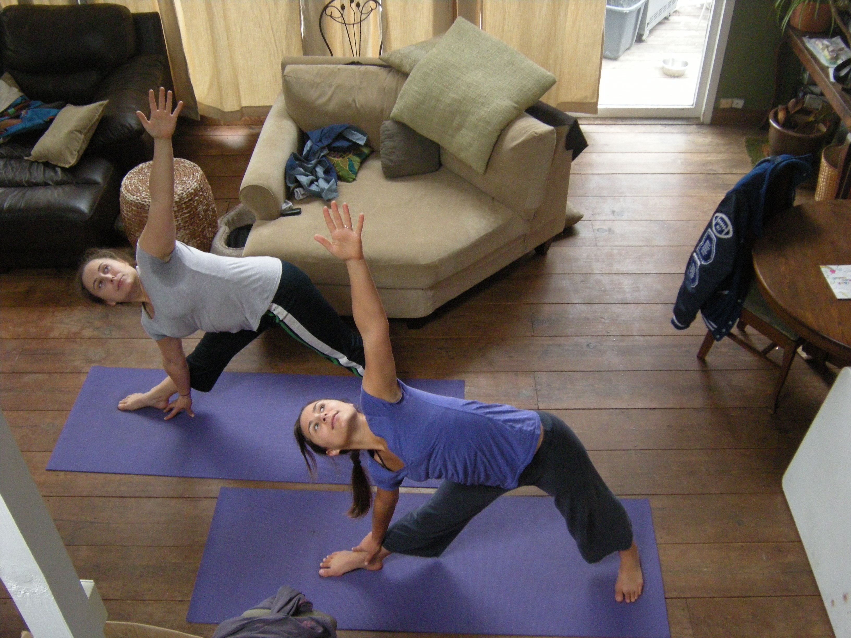 What you can’t see in these pictures is my sister’s mother-in-law watching us from the couch and my sister’s nephew sleeping on the other couch! He only roused briefly as we performed a very intense “breathe of fire” exercise. If you’re not familiar with “breathe of fire”, he managed to mumble, “you sound like panting dogs”. He’s 17.