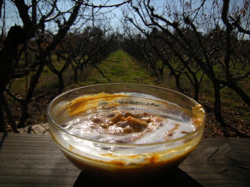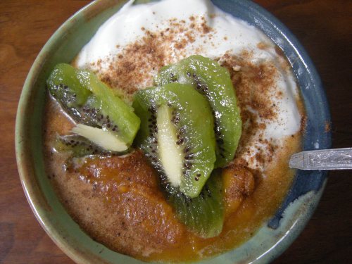 Pumpkin and plain yogurt topped with cardamon, garam masala, and a kiwi. This will hold me until 2pm “dinner” time. It was delicious and satisfying and I enjoyed every bite.
